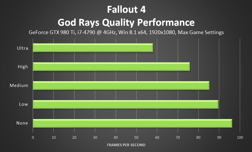 The graph proves that god rays setting alone will hit GTX 980 Ti from 97 fps to 58 fps. It’s something I’d call abnormal for a very least. I see the quality difference between low and ultra god rays – I don’t understand how it’s worth 40 fps on a high-end card. I know games that uses volumetric lighting, but for some reason, it’s only Fallout 4 god rays are so expensive.