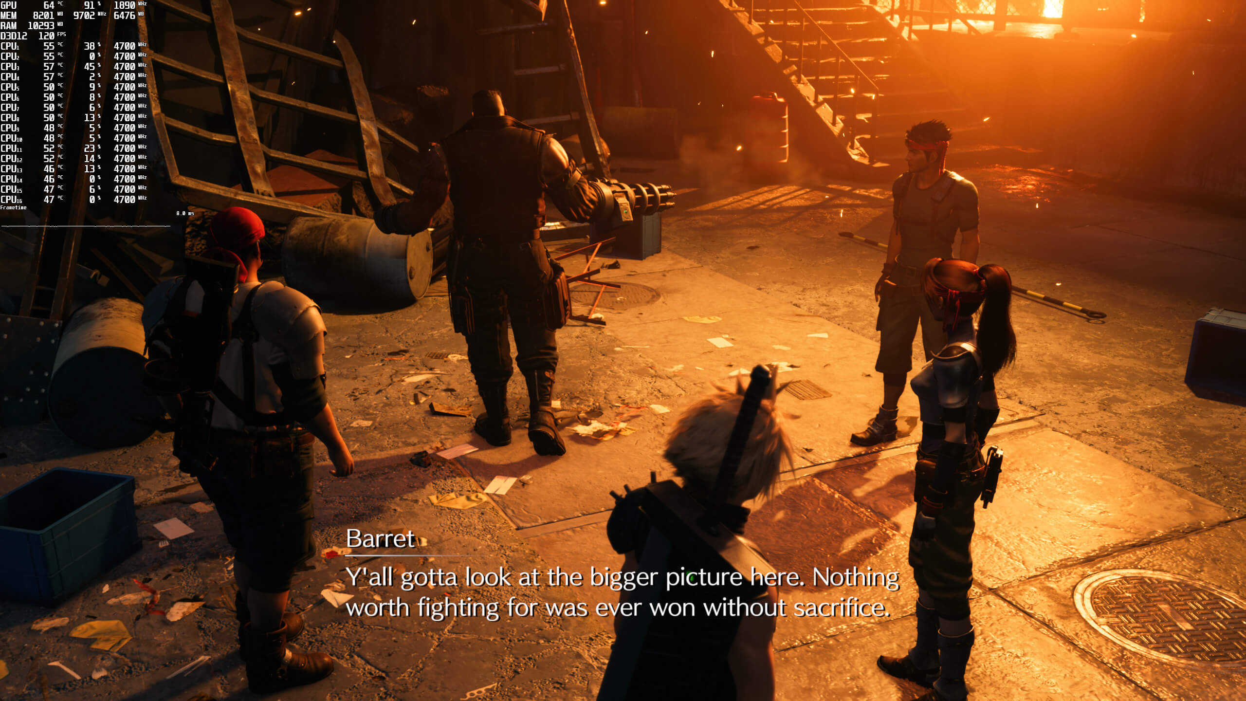 I also don’t know what’s wrong with Alex’s PC system, but Rivatunner catches ALL of the stutters we’re experiencing in FF7R (he claims that it does not, that’s inaccurate). Rivatunner even caught some minor stutters that you wouldn’t be noticing them unless you were looking directly at the frametime graph.