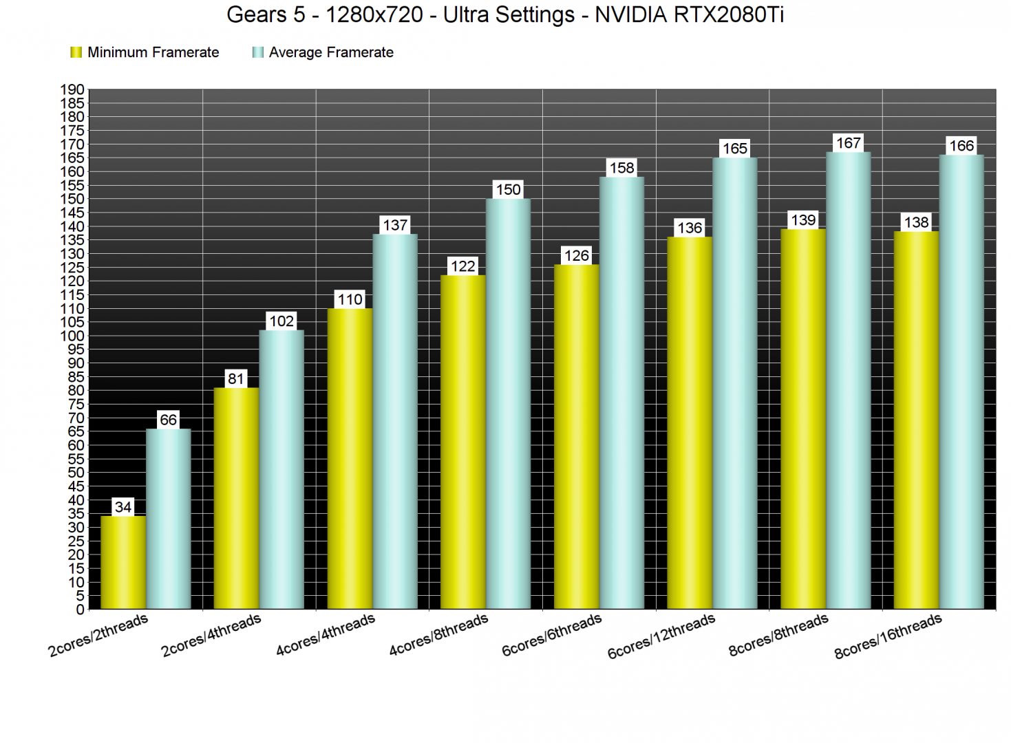 In order to find out how the game scales on multiple CPU threads, we simulated a dual-core, a quad-core and a hexa-core CPU. We also used the game’s built-in benchmark tool as it’s representative of the in-game performance you’ll be getting. Now even though we lowered our resolution to 720p, we were still GPU-limited on most of our setups. This basically suggests that Gears 5 does not require a high-end CPU.