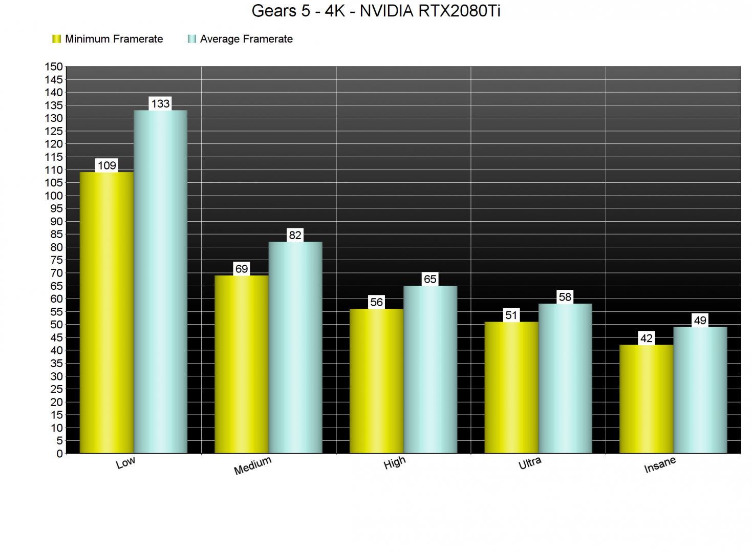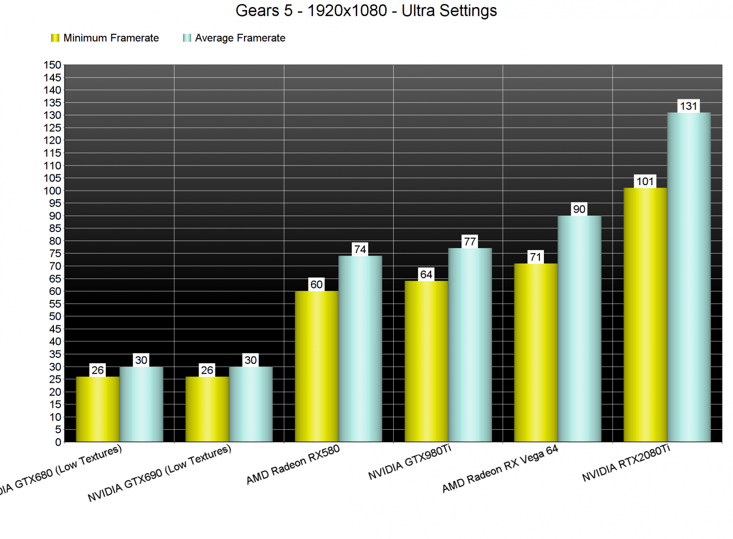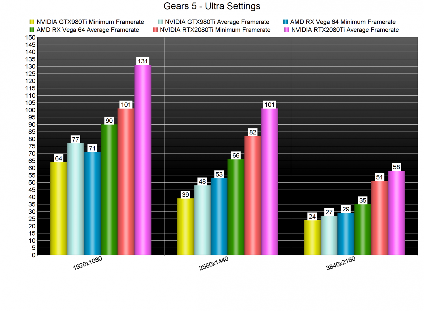 At 1080p, most of our GPUs were able to offer a 60fps experience on Ultra settings. Moreover, and contrary to other Unreal Engine 4 games, Gears 5 works like a dream on AMD’s hardware. The AMD Radeon RX580, for example, was almost able to match the performance of the NVIDIA GTX980Ti.