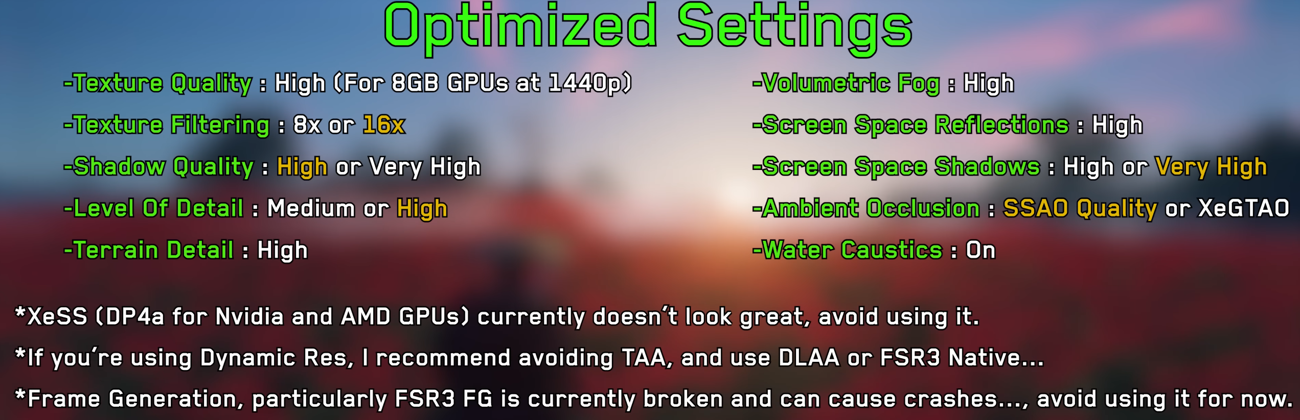 I recommend checking out the optimization guide by BenchmarKing on youtube as there are substantial performance gains that can be had at the cost of a small visual quality loss. Screenshot of his vid with his recommended settings (I recommend using XeGTAO instead of SSAO though): https://uploads.disquscdn.com/images/a885d360e61b682bdf1c805c62fe48661266f63775fa9b3f25b732b37db64206.png