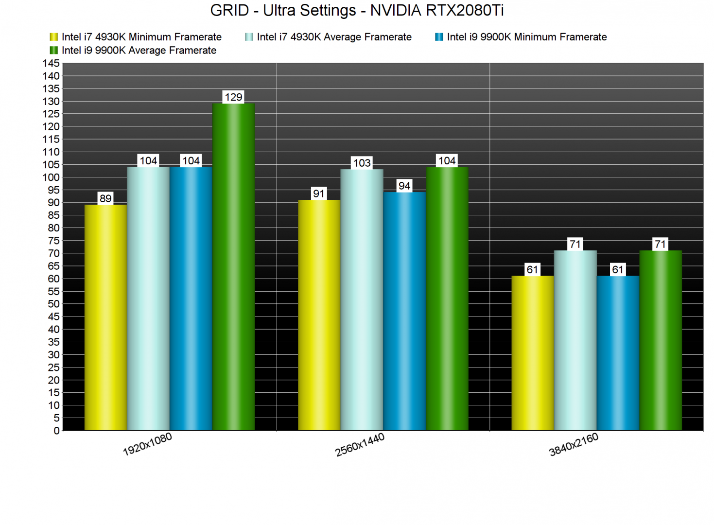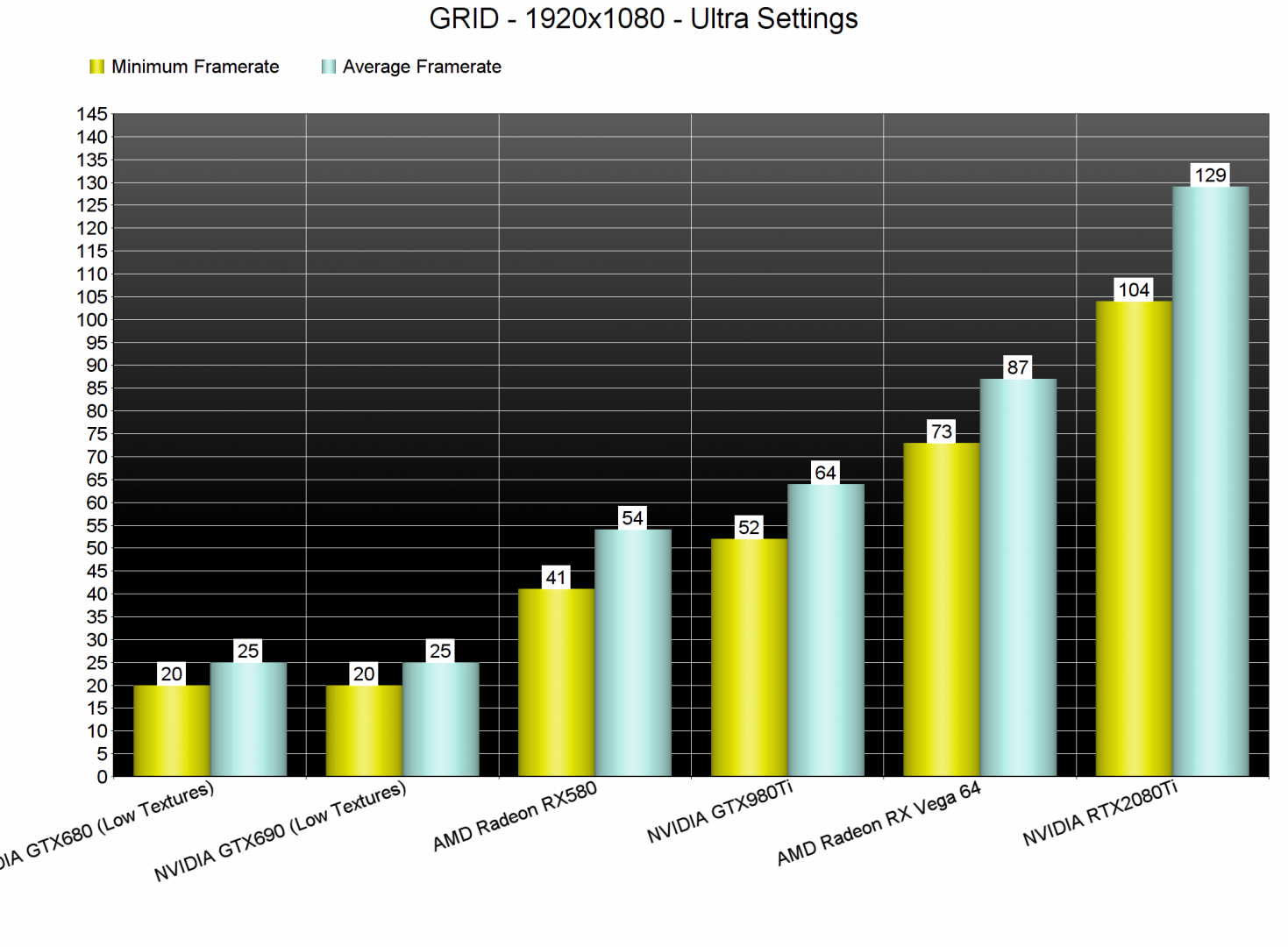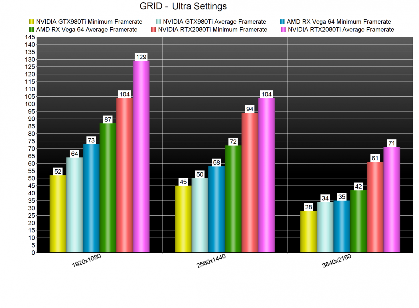 GRID also requires a powerful GPU in order to be enjoyed on Ultra settings. Only the Vega 64 and the RTX2080Ti were able to offer a constant 60fps experience at 1080p/Ultra. Our GTX980Ti also came close to it, though there were some drops to 54fps.
