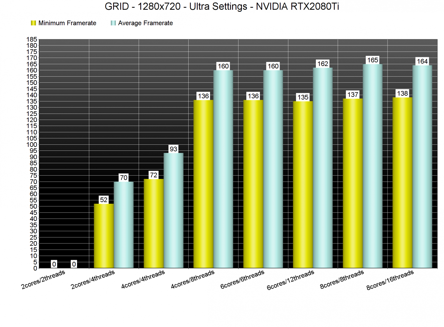 GRID 2019 is one of the few games that benefits from more than eight CPU cores/threads. While our overall framerates were not increased, our hexa-core and eight-core systems suffered from stuttering issues when Hyper Threading was disabled. Take a look at the first image that accompanies this article; you can easily see the game using ten CPU threads. Therefore, and in order to avoid any stutters, we strongly suggest enabling Hyper Threading for this particular title.