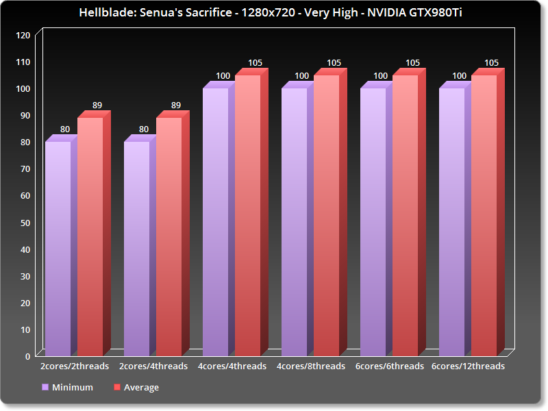 Hellblade: Senua’s Sacrifice is a GPU-bound title. In order to find out how the game performs on a variety of CPUs, we simulated a dual-core and a quad-core CPU. As we can see, there is a minimal performance difference between our simulated dual-core and our simulated quad-core systems. On the other hand, our simulated quad-core and our six-core systems performed similarly. Moreover, we did not witness any performance increase when we enabled Hyper Threading. Not only that, but it appears that the game suffers from some CPU scaling issues (or it’s simply unable to utilise high-end GPUs for high framerates). As we can see below, our GTX980Ti was not used to its fullest at 720p. Yes, we’re talking about more than 90fps here, however this is an optimization issue that needs to be addressed, despite the fact that even a modern-day dual-core CPU can handle this latest game with constant 60fps.
