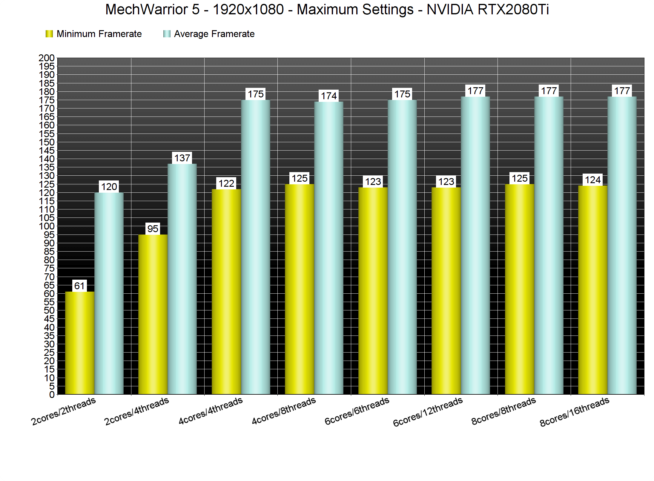 Similarly to other recent games, MechWarrior 5: Mercenaries appears to be a GPU-bound title. In order to find out how the game scales on multiple CPU threads, we simulated a dual-core, a quad-core and a hexa-core CPU. And we are happy to report that even our simulated dual-core system was able to provide a 60fps experience at 1080p/Max settings. However, and despite pushing 60fps, there were some frame pacing issues on that particular system when Hyper Threading was disabled. With Hyper Threading enabled, the game was silky smooth.