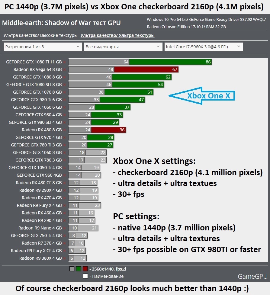 ARK kills every GPU that’s out there, even on 1080p 1080ti 2GHz OC drops into 50fps territory, so no wonder console have to use medium settings in order to hold solid 60fps. XboX GPU is not 580RX as you trying to suggest. Maybe at some point xboX GPU was indeed based on 580RX, but after removing the biggest bottlenecks that this chip had (you can read about that in articles that talks about xboX), and after adding Vega architecture features that card should be way faster. Also hardware resources on consoles are used much more efficient. Even PS4pro with 4.2tflops GPU polaris architecture is sometimes above 980GTX and almost catching 980ti performance level on PC (for example in COD games), and xboX is 2x as fast compared to PS4pro as you can even tell looking at games resolutions (4K on xboX instead of 1440p PS4pro). In gears of war 4 max settings xboX offers 4K native 30fps, and 580RX on PC cant do that. First card that can do that is 980ti (33fps average on guru3d benchmark chart), but I think xboX will need to push somewhere around 40+fps in order to hold 30fps most of the time during normal gameplay. So in order to mach xboX settings in that particular game, you have to own 980ti as minimum (drops below 30fps will be frequent with only 33fps average), or simply have 1080GTX.
