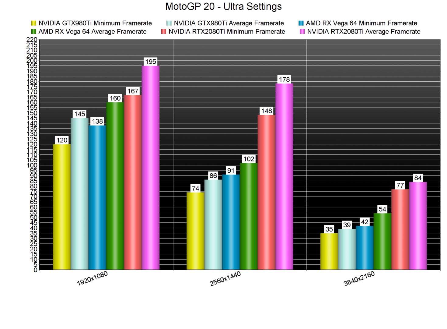 MotoGP 20 does not also require a high-end GPU for gaming at 1080p or 1440p. With the exception of our NVIDIA GTX690, all of our other GPUs were able to run the game with 60fps at 1080p/Ultra settings.