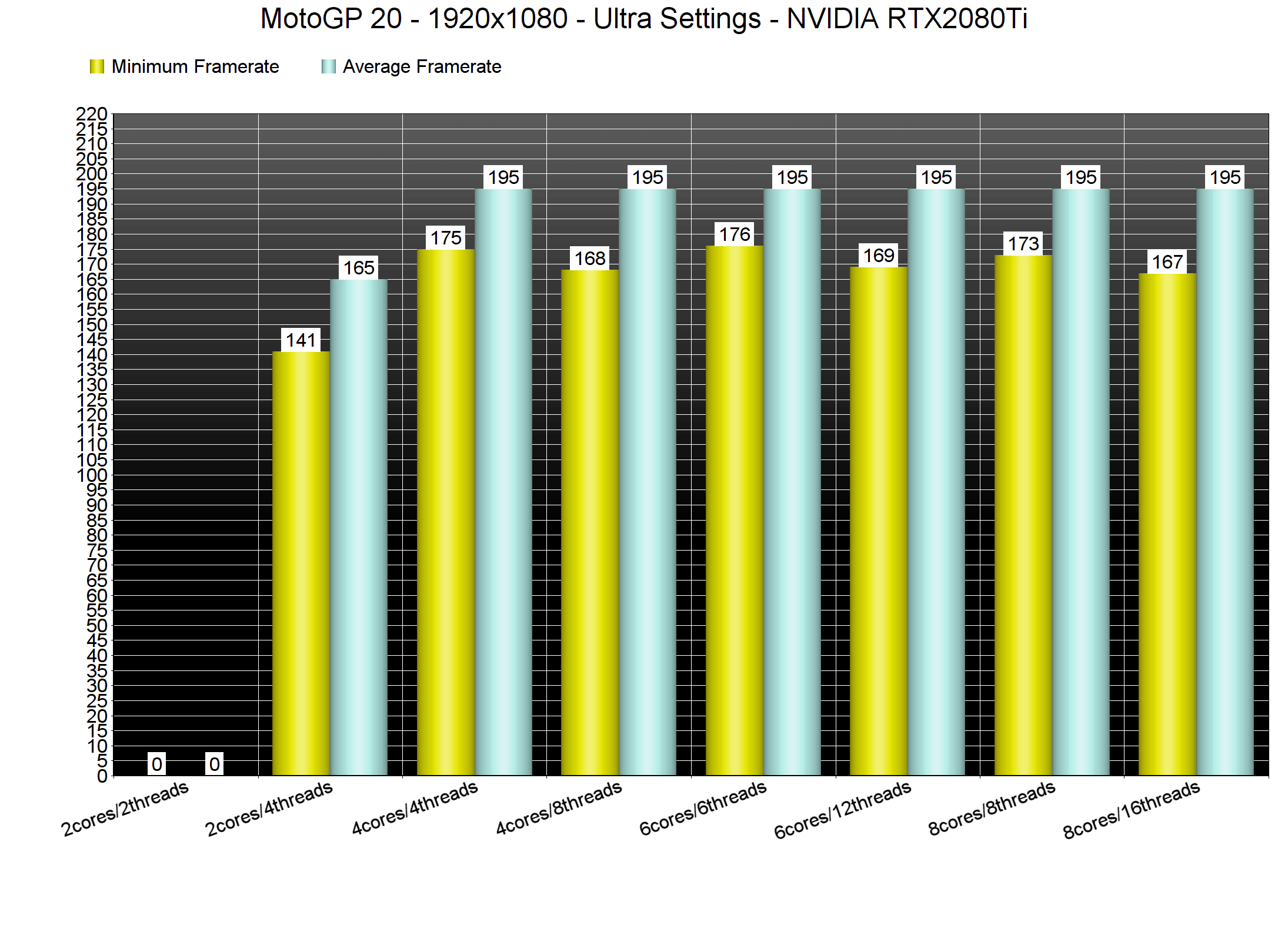 In order to find out how the game scales on multiple CPU threads, we simulated a dual-core, a quad-core and a hexa-core CPU. And, thankfully, MotoGP 20 does not require a powerful CPU for gaming at 100fps. As we can see, our simulated dual-core system (with Hyper Threading enabled) was more than enough to run the game.
