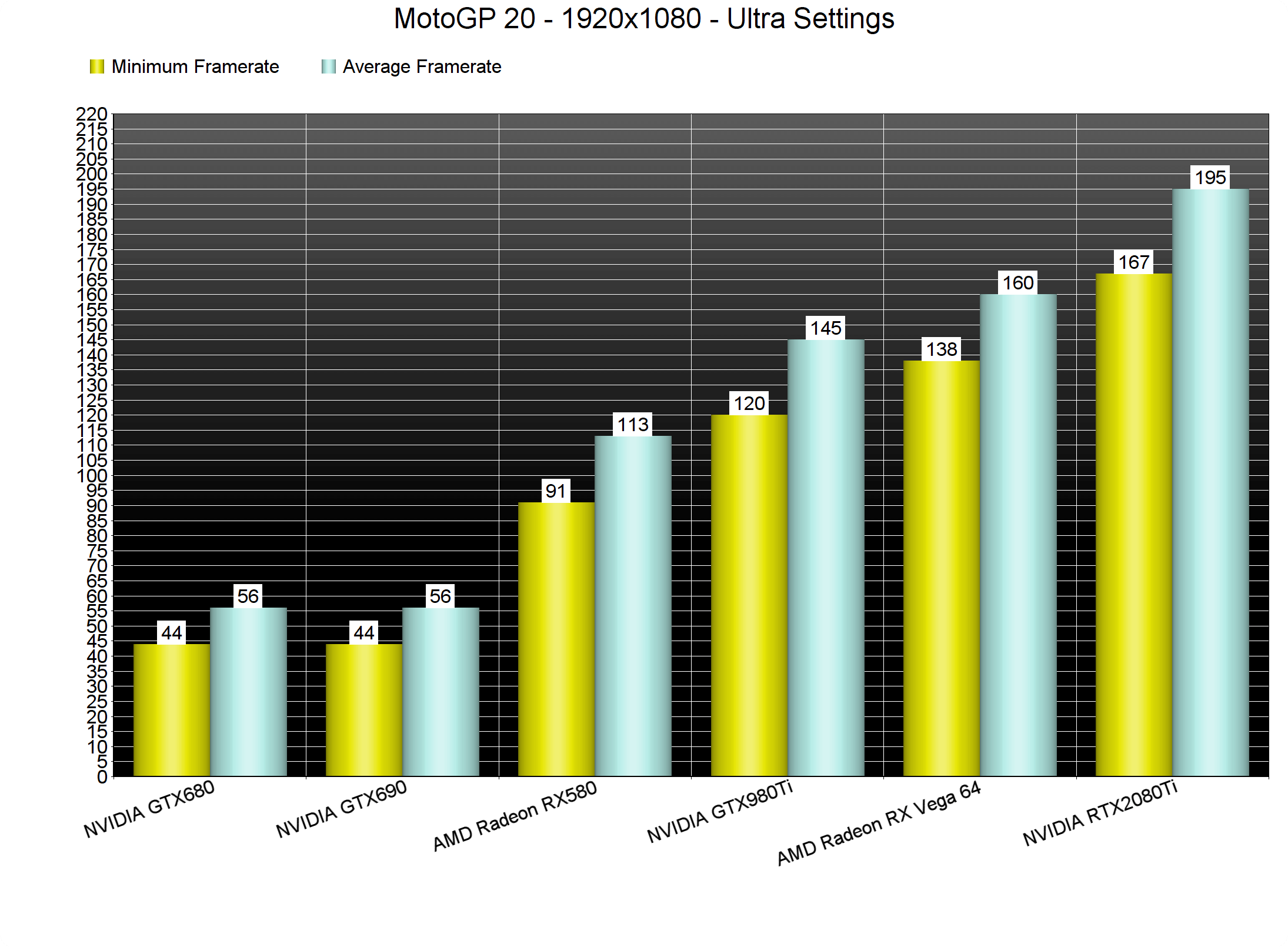 MotoGP 20 does not also require a high-end GPU for gaming at 1080p or 1440p. With the exception of our NVIDIA GTX690, all of our other GPUs were able to run the game with 60fps at 1080p/Ultra settings.