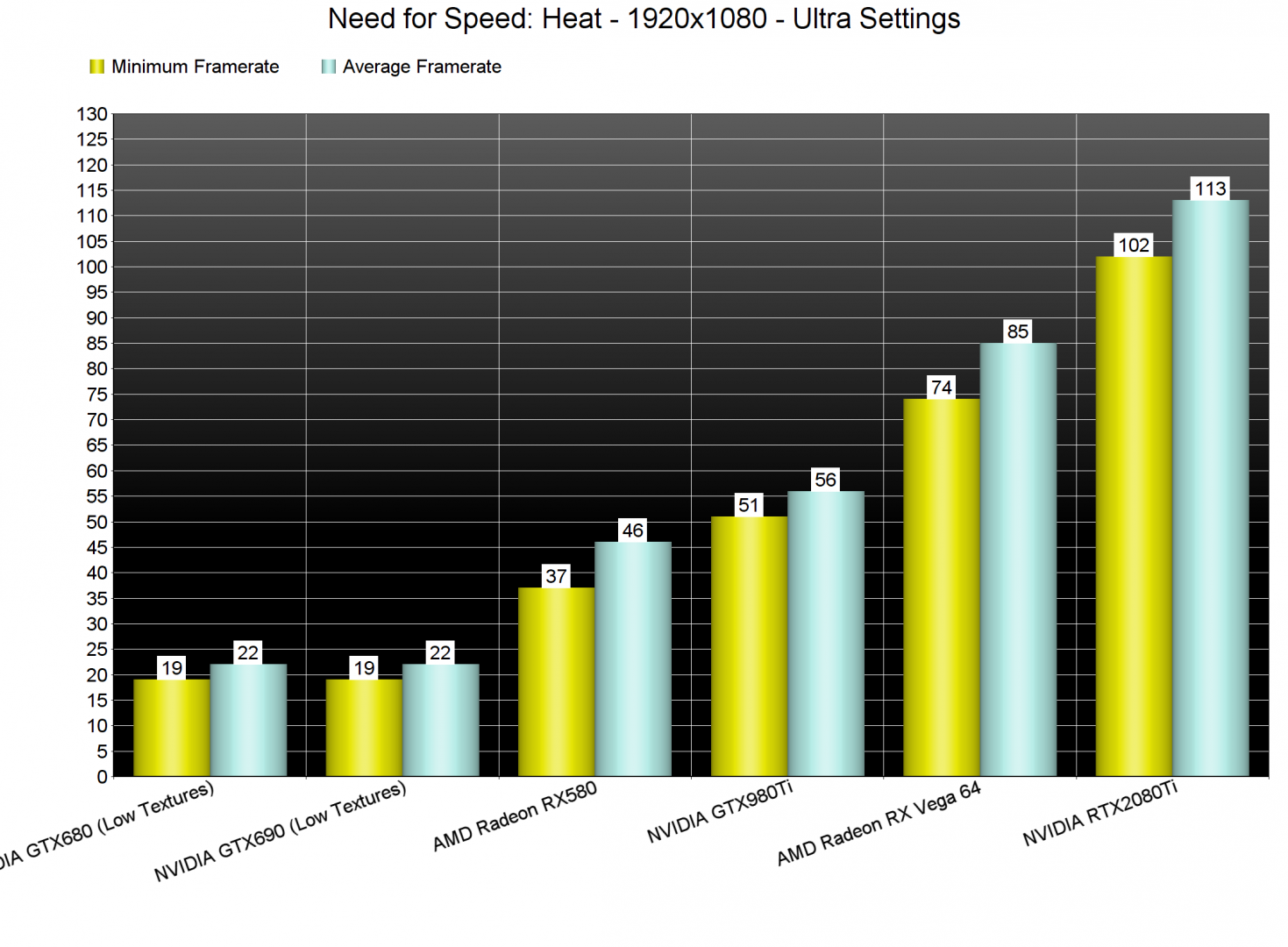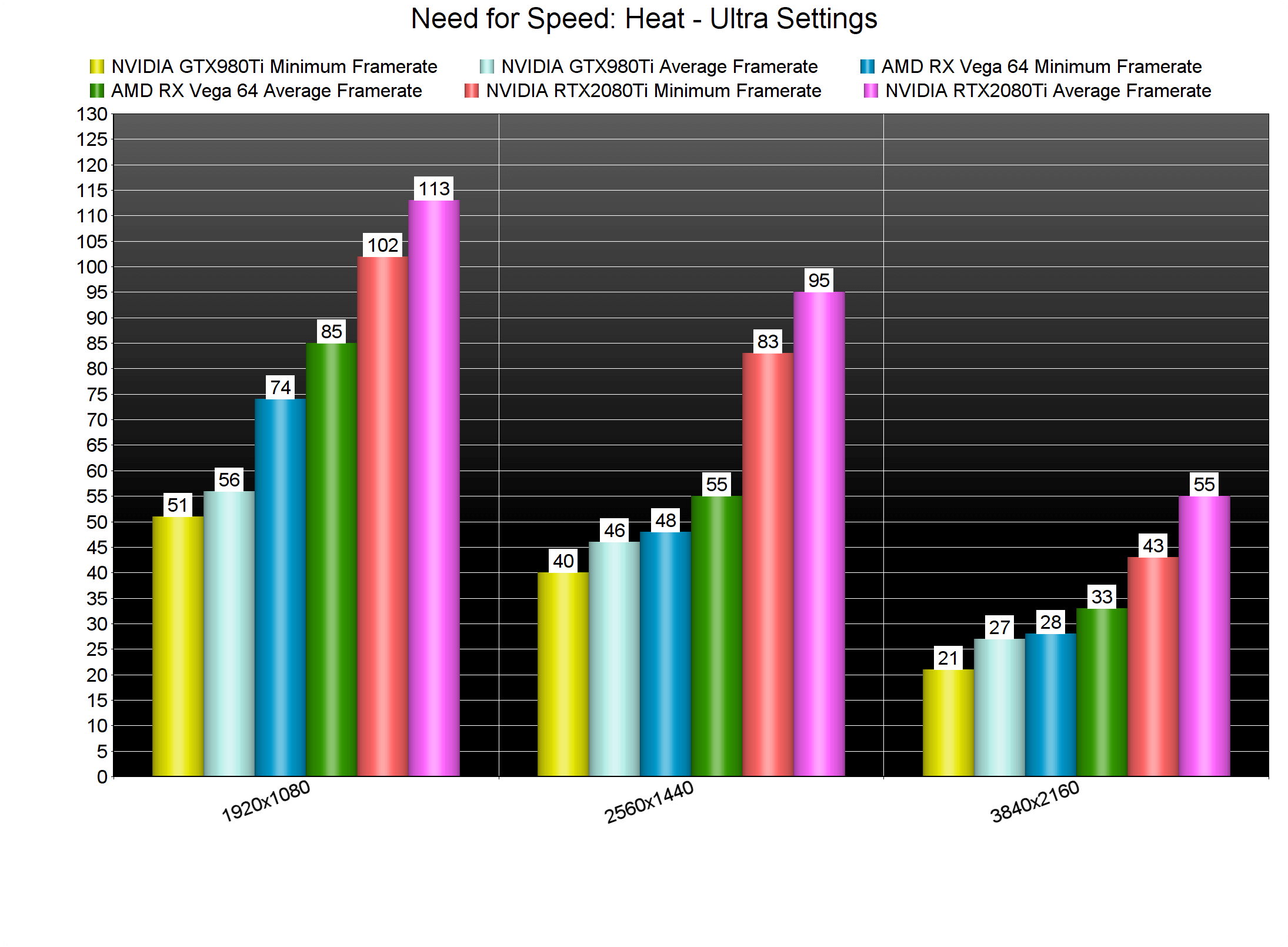 Need for Speed: Heat also requires high-end GPUs in order to be enjoyed. The only GPUs that were able to offer a smooth experience at 1080p/Ultra were the Vega 64 and the RTX2080Ti. The GTX980Ti was unable to offer a 60fps experience even at 1080p.