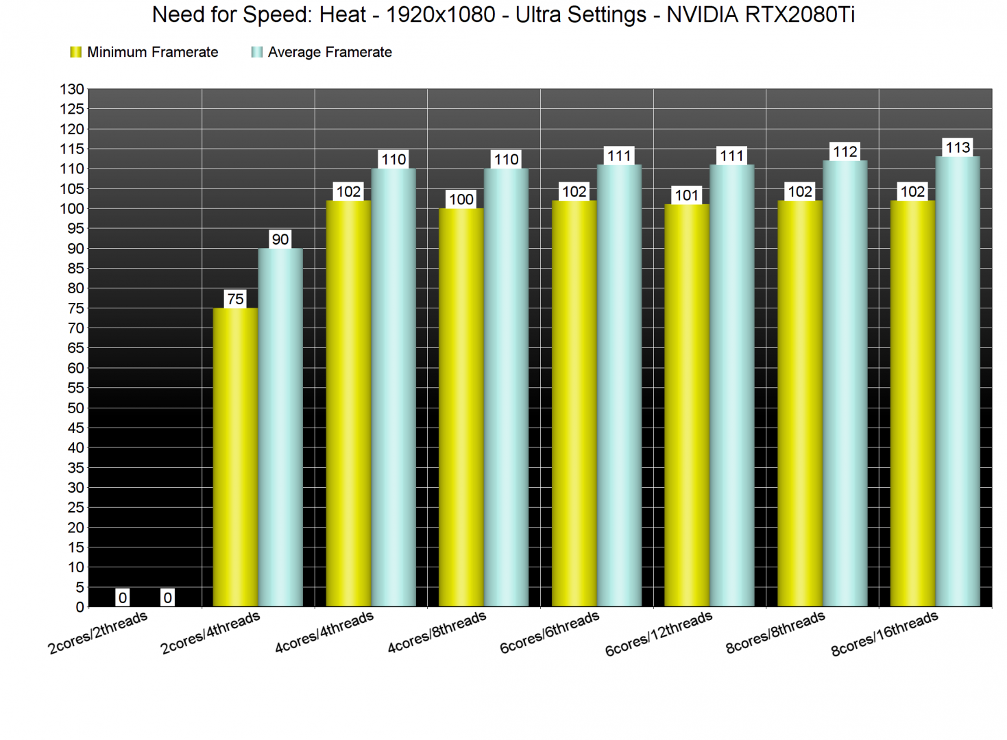 In order to find out how the game scales on multiple CPU threads, we simulated a dual-core, a quad-core and a hexa-core CPU. For some strange reason, the game would not launch when Hyper Threading was disabled. We were able to replicate this multiple times, so we are not sure what is going on here. Not only that, but the game would not load at all on our Intel i7 4930K system. That CPU is well above the game’s minimum CPU requirements. However, the game was immediately closing and “disappearing” from the task manager. Need for Speed: Heat uses Denuvo so I don’t know whether these launch issues are due to this anti-tamper tech. Bottom line is that we could not test the game on a variety of CPUs, and we are not the only ones facing this issue.