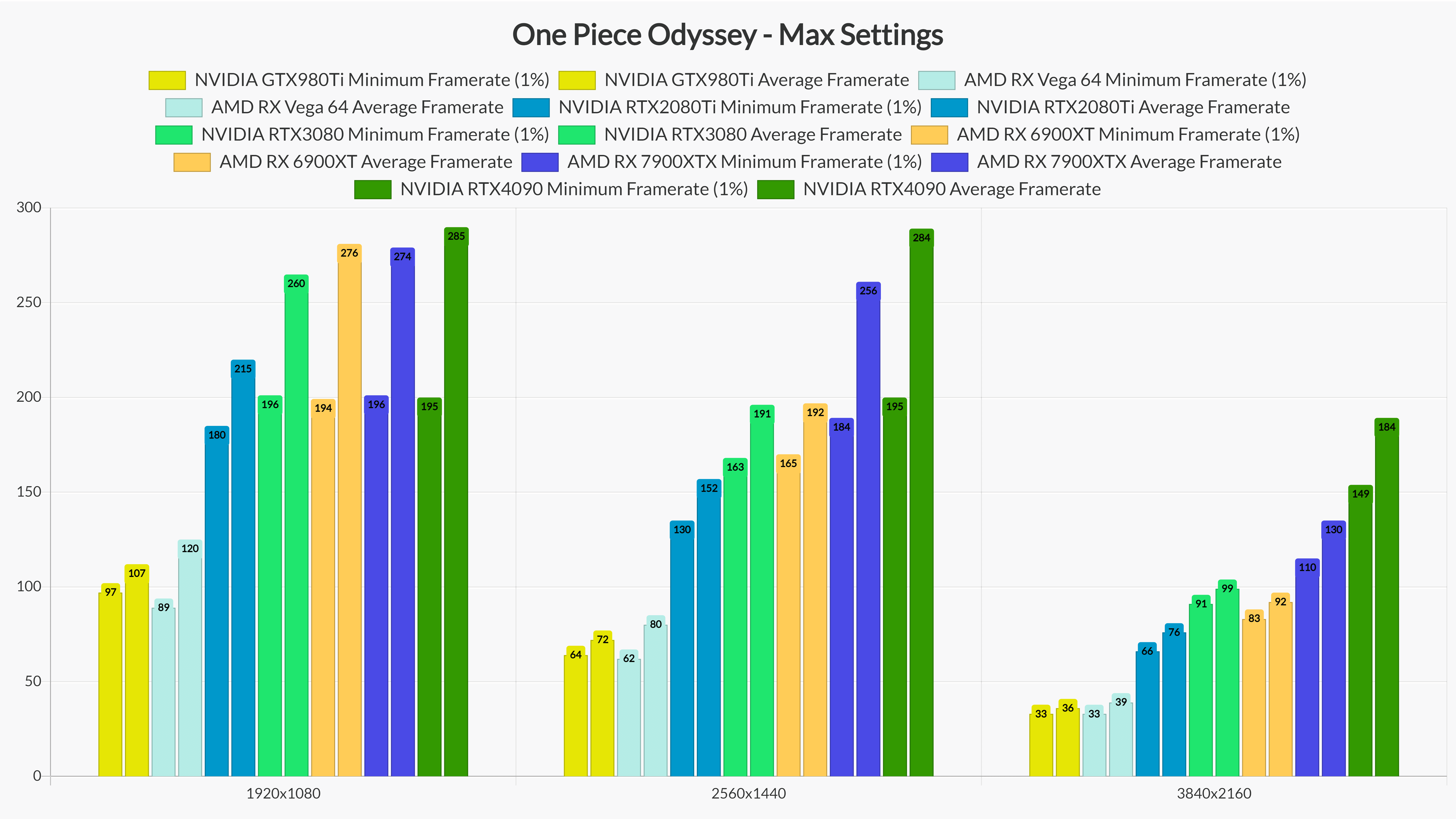 At 1440p/Max Settings, even the NVIDIA GTX980Ti and the AMD Radeon RX Vega 64 could provide a smooth gaming experience. And as for 4K/Max Settings, the RTX2080Ti, RTX3080, RTX4090, RX6900XT and RX7900XTX had no trouble at all pushing constant 60fps.