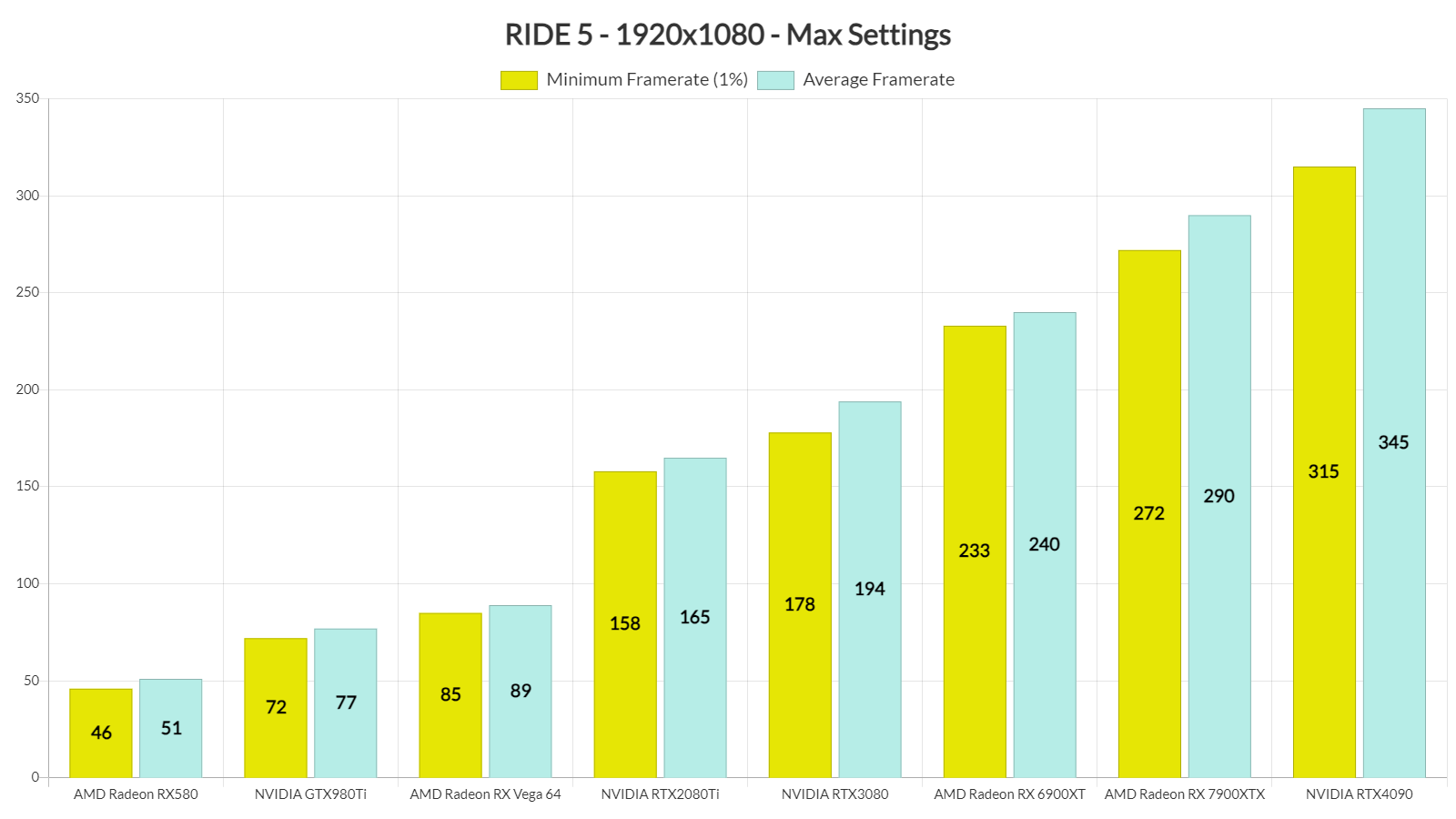 RIDE 5 does not require a high-end CPU in order to be enjoyed. At 1080p/Max Settings, our NVIDIA GeForce RTX 4090 was able to push over 300fps in our stress test. Thus, we can safely say that the game will run smoothly on a wide range of PC configurations.