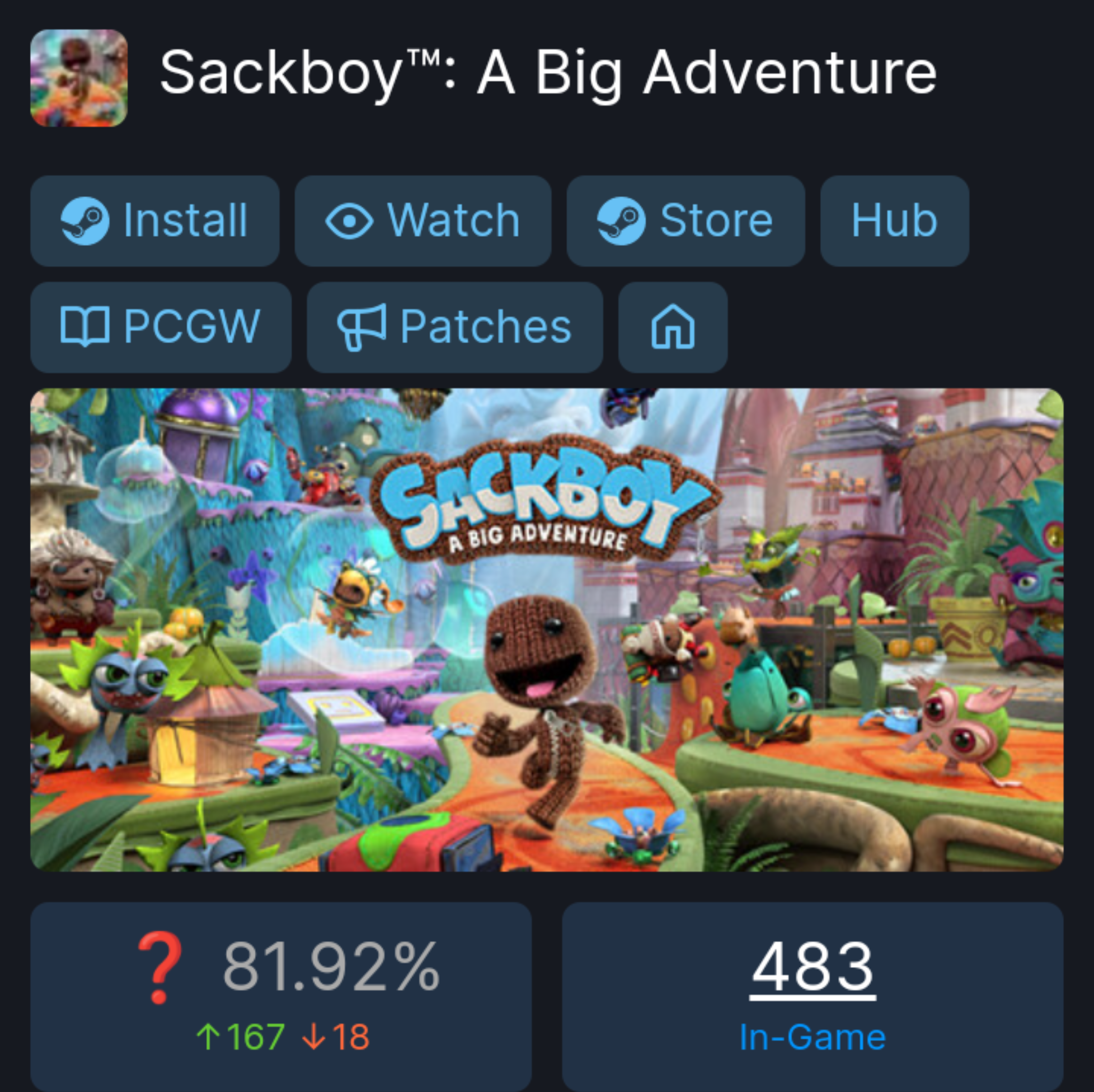 Fired this up last night and it’s pretty stuttery on my system, at least during loading and some cutscene stuff, seems pretty smooth during gameplay at 1080p, dlss performance, very high/high, 60 locked, have not turned on RT at all. 2060m, i5-10300h. Sony ports seem to be that way though, not very optimized for pc, bloated game size and such. This game is very similar to Nintendos Yoshis woolly world and the last one Yoshis crafted world both less than 10gb in size emulated. It’s fun if you like this sort of game but not as fun as either of those two emulated or on the native systems. Of course they had to make a point to put sicko trannystein costume in their, the baphomet trannyclub rolls on. Research it on bitc**te, no going back afterwards though so be careful, red pill/blue pill stuff.