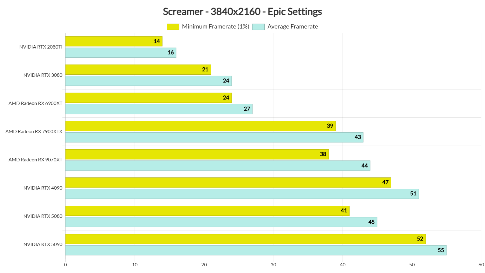 Finally, at Native 4K with Epic Settings, there isn’t any GPU that can provide a 60FPS experience. The NVIDIA GeForce RTX 5090 pushes a minimum of 52FPS and an average of 56FPS.