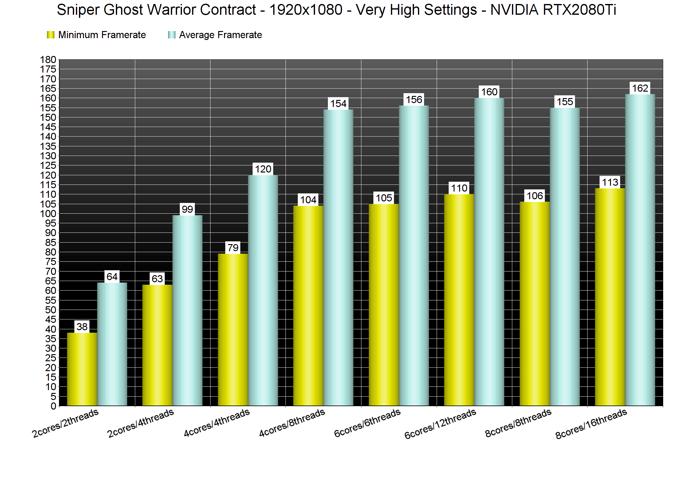 In order to find out how the game scales on multiple CPU threads, we simulated a dual-core, a quad-core and a hexa-core CPU. And even though it’s only using the DirectX 11 API, Sniper Ghost Warrior Contracts does not require a high-end CPU. With Hyper Threading enabled, our simulated dual-core system was able to provide a constant 60fps experience at 1080p/Very High.