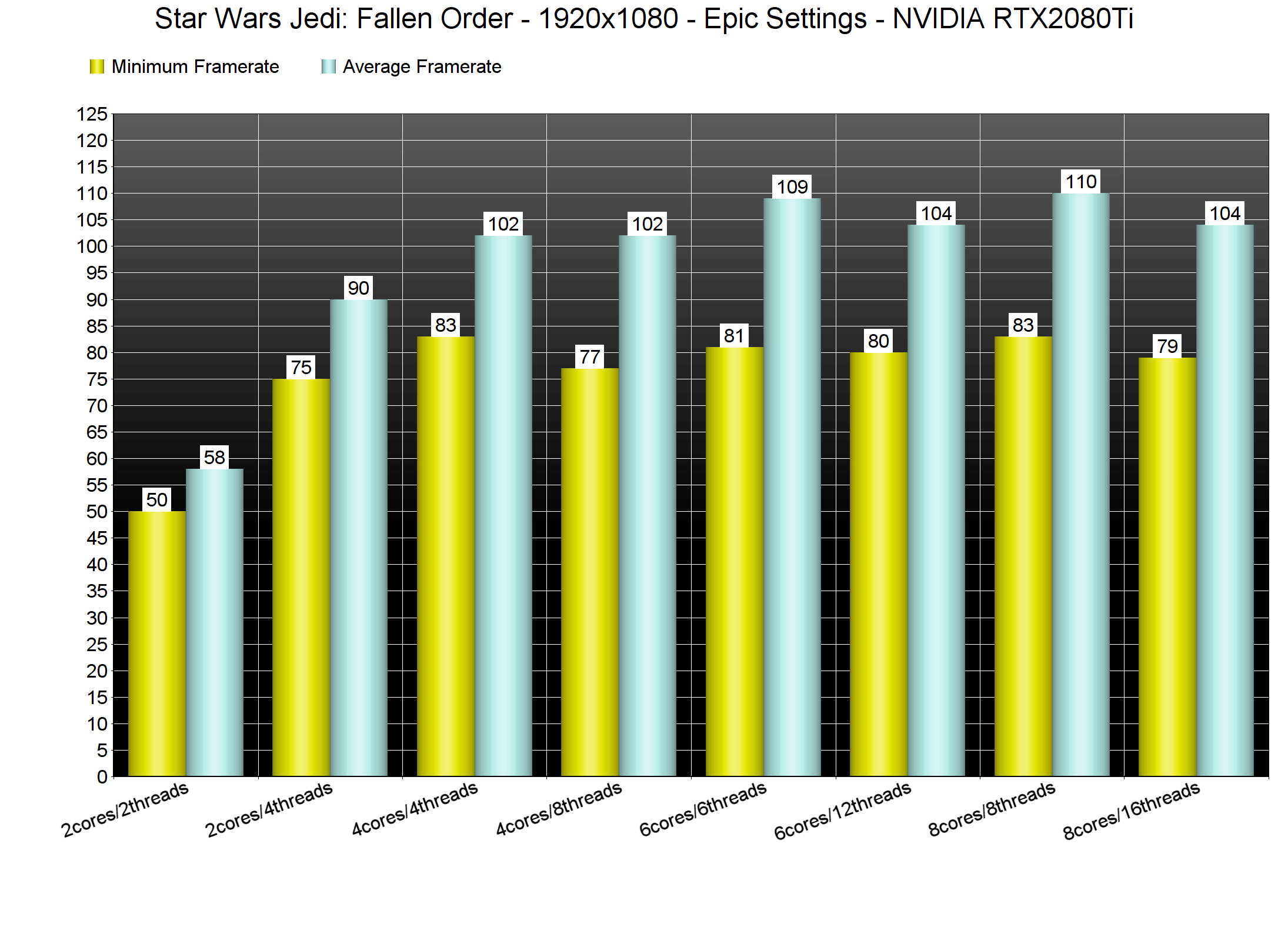 This new Star Wars game does not appear to require a high-end CPU. In order to find out how the game scales on multiple CPU threads, we simulated a dual-core, a quad-core and a hexa-core CPU. Without Hyper Threading, our simulated dual-core system was able to come close to a 60fps experience at 1080p/Epic. However, there were major stuttering issues while exploring the environments, as well as drops to 50fps. With Hyper Threading enabled, we were able to get a constant 60fps experience.