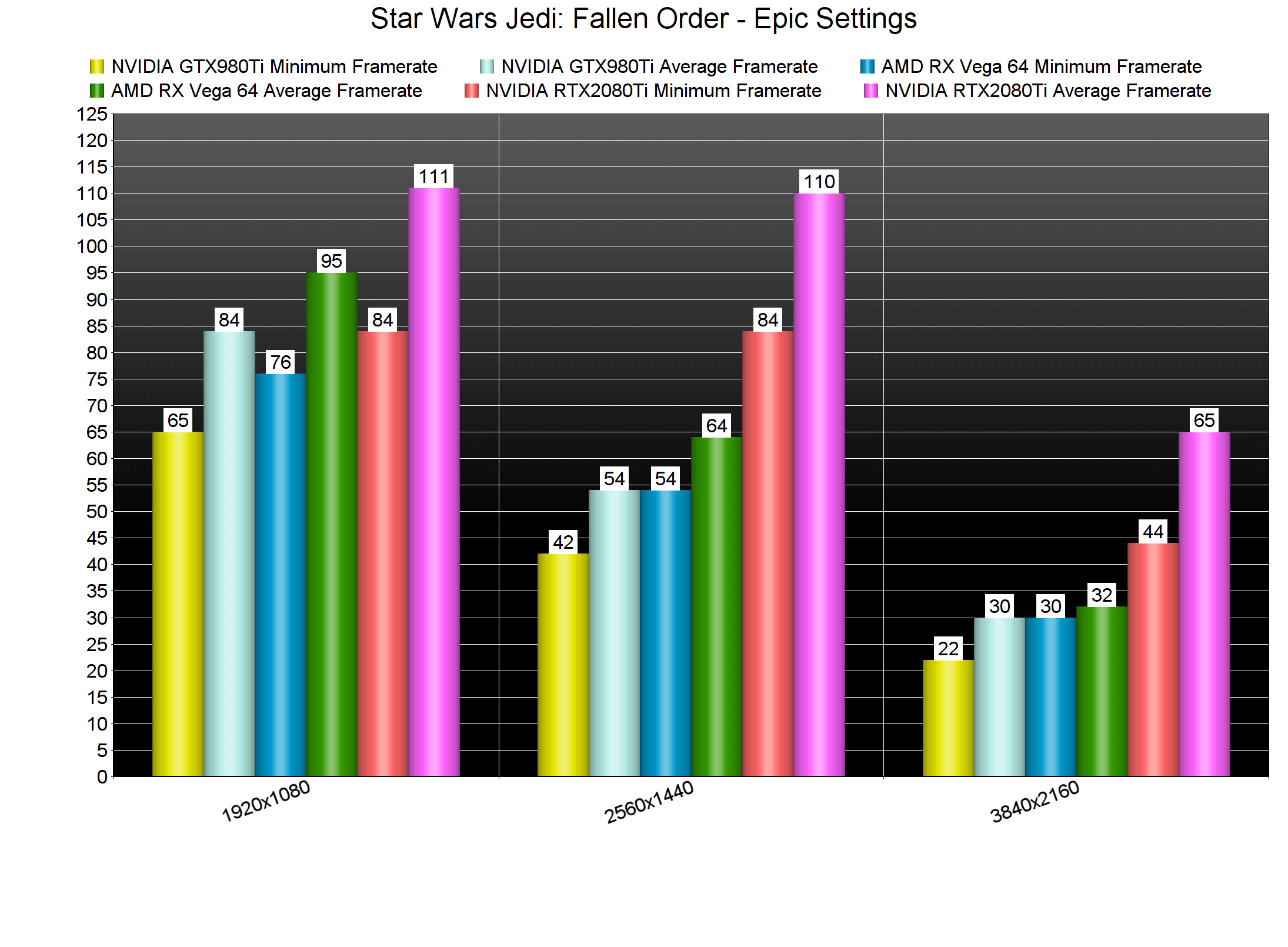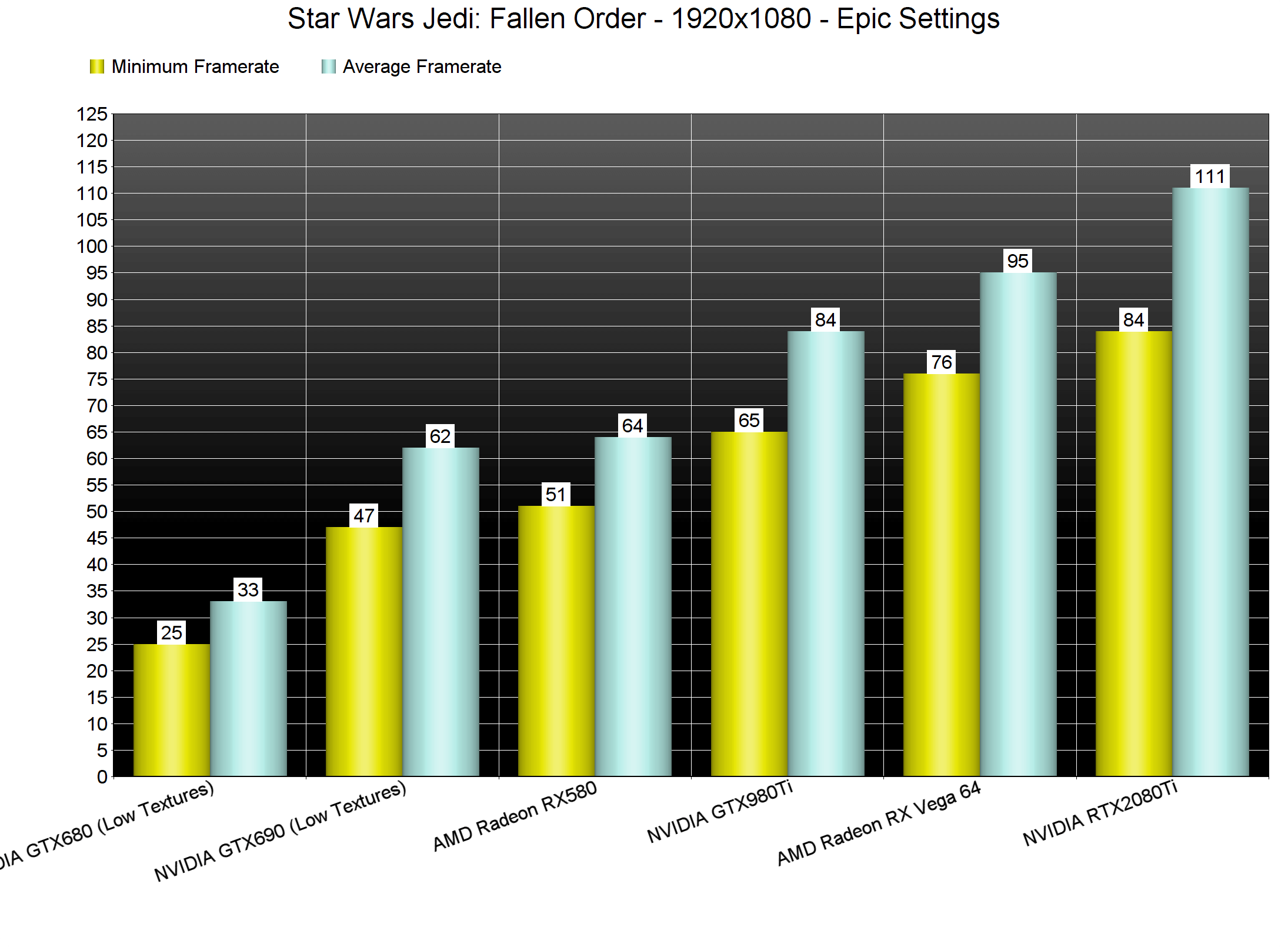 Star Wars Jedi: Fallen Order does not also require a powerful GPU in order to be enjoyed. Our GTX980Ti, Vega 64 and RTX2080Ti had no trouble running the game with 60fps at 1080p/Epic settings. Our AMD Radeon RX580 also provided a 60fps experience (though there were occasional dips to 50fps).