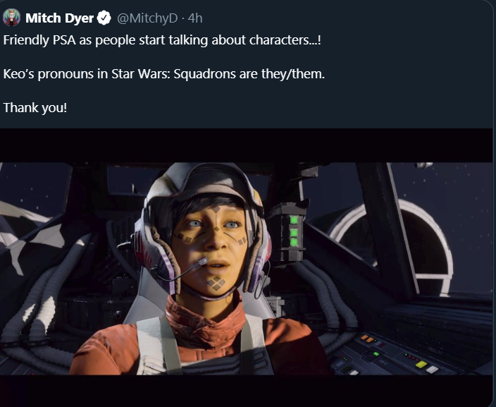 1. No different than gearbox saying the same about flak in borderlands 3 but at least ea isn’t banning people on their forums over it like gearbox does if you call flak “him, he” etc.