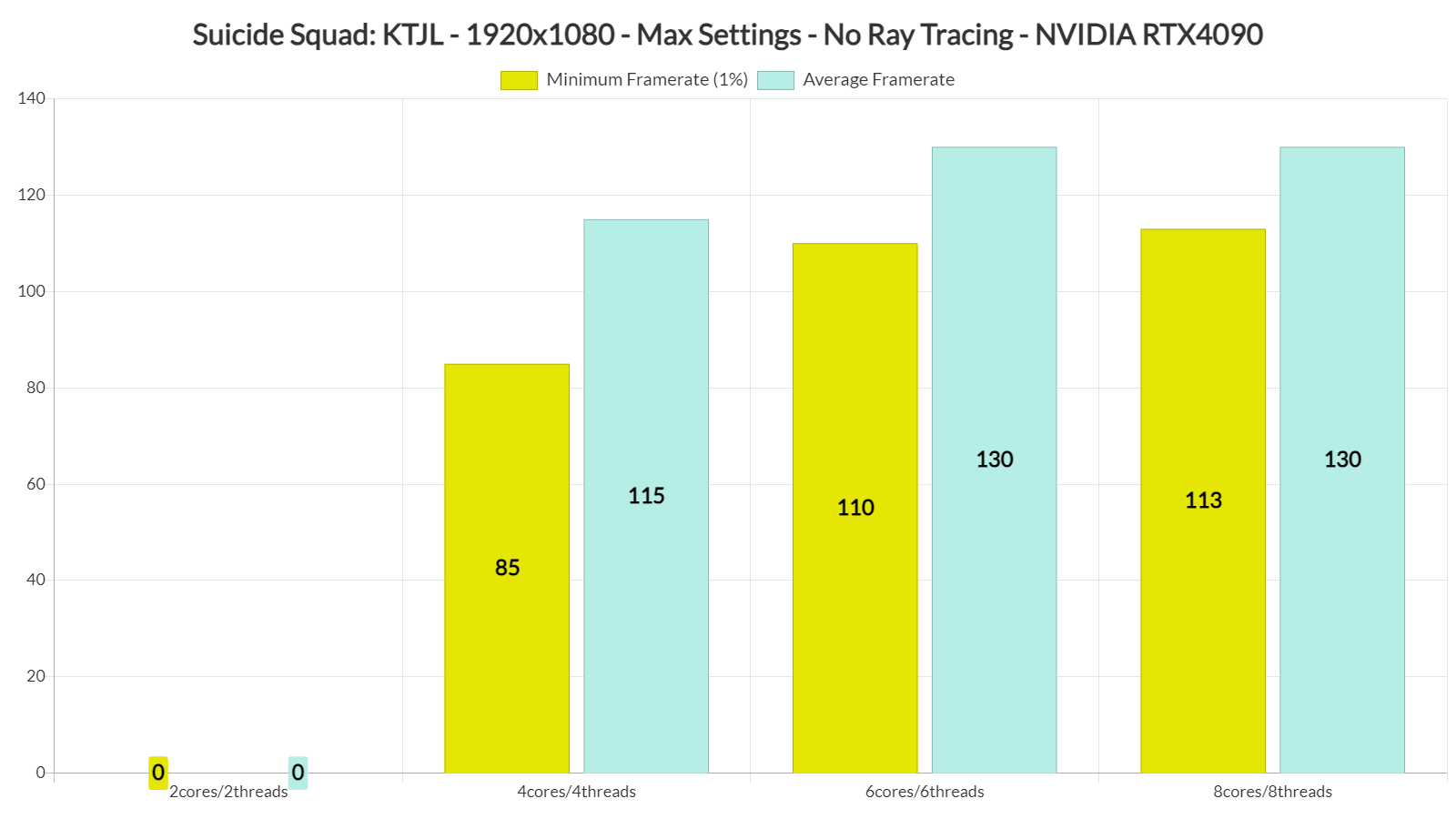 On our simulated dual-core system, the game was crashing when loading a level. On the other hand, our simulated quad-core was able to provide a constant 60fps experience at 1080p/Max Settings/No Ray Tracing. It’s also worth noting that Suicide Squad: KTJL can effectively take advantage of five CPU threads. Take a look below at the core/thread scaling on our simulated hexa-core CPU (five out of six CPU cores were used at 80-90%).