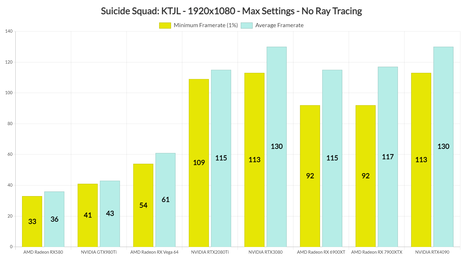 At 1080p/Max Settings/No RT, the game could run smoothly on the majority of our GPUs. Suicide Squad: Kill the Justice League uses the DX12 API. So, it’s a bit weird to see the NVIDIA RTX3080 outperforming the AMD RX6900XT and RX7900XTX at 1080p.
