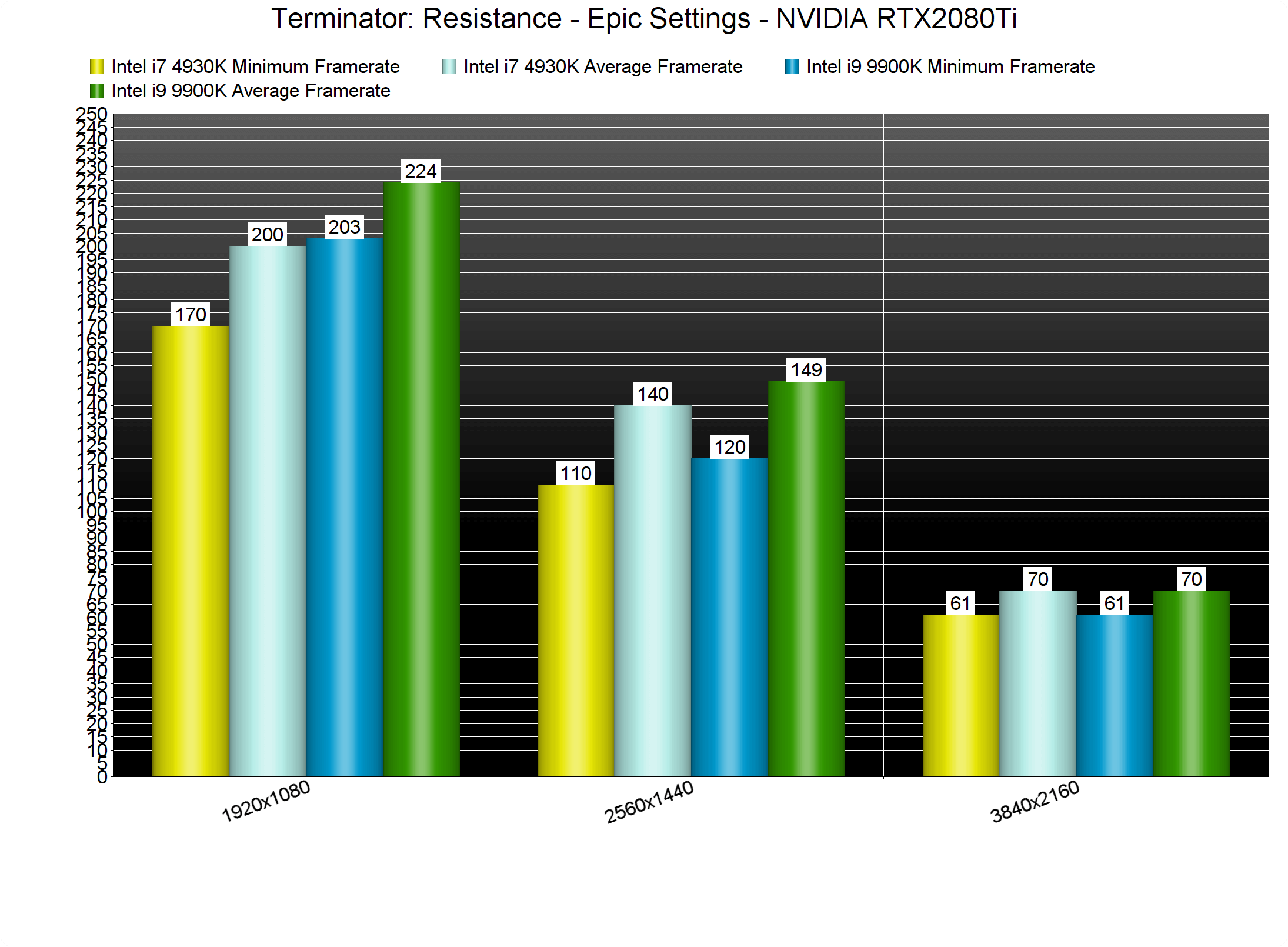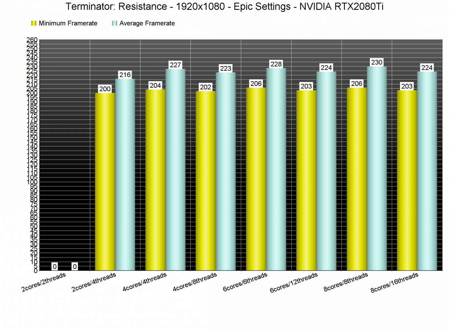 In order to find out how the game scales on multiple CPU threads, we simulated a dual-core, a quad-core and a hexa-core CPU. And we are happy to report that this new Terminator game does not require a high-end CPU. Without Hyper Threading, our simulated dual-core was unable to run the game due to extreme stuttering issues. With Hyper Threading enabled, our dual-core was able to push a minimum of 200fps and an average of 216fps.