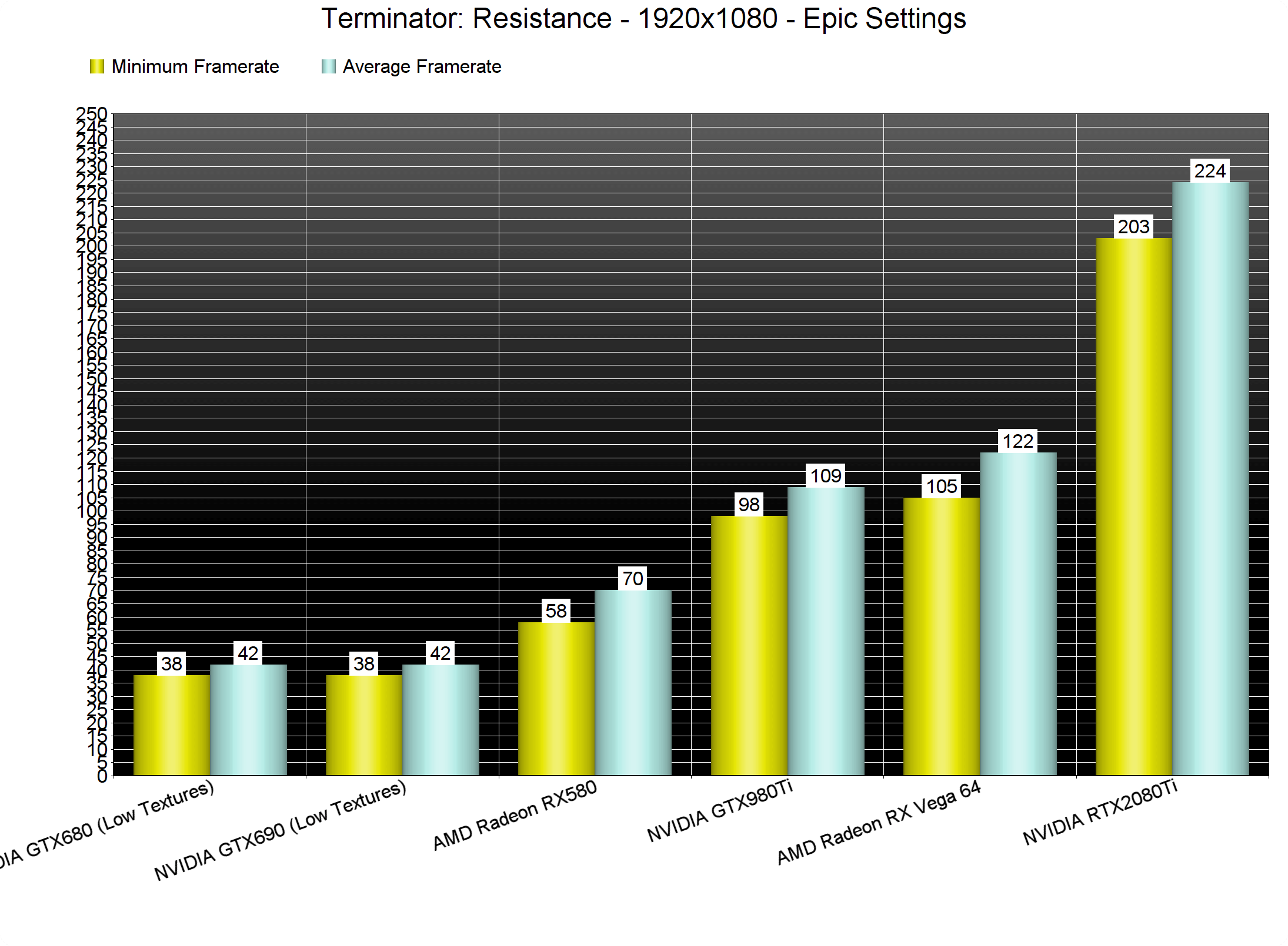Terminator: Resistance does not also require a high-end graphics card. Most of our GPUs were able to offer a smooth gameplay experience at 1080p/Epic. Hell, even our NVIDIA GTX680 was able to offer a “console” 30fps experience. Therefore, expect to be running smoothly this latest Unreal Engine 4 game on a variety of PC configurations.