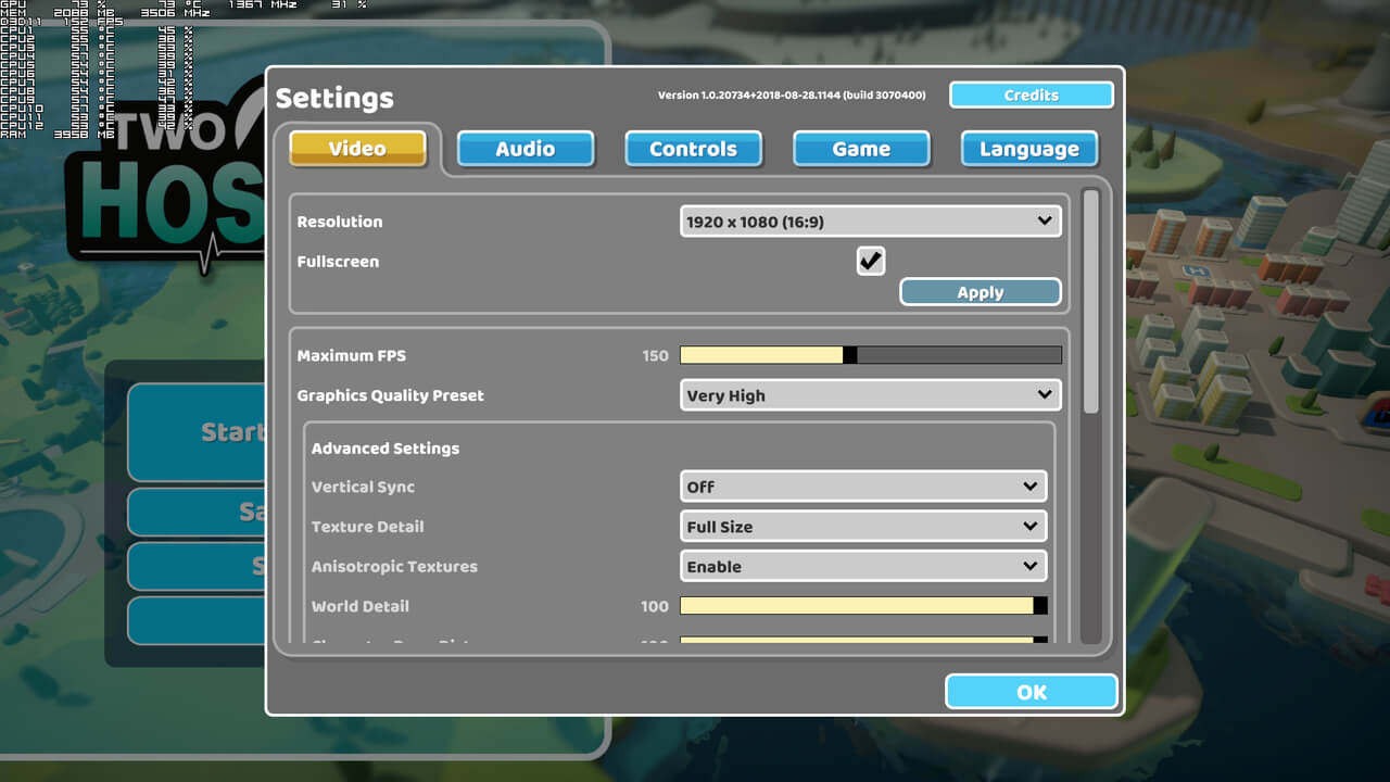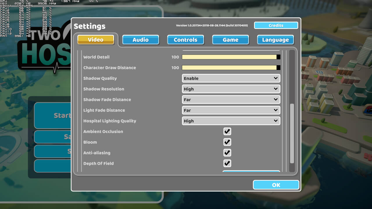Two Point Studios has implemented a few graphics settings to tweak. PC gamers can adjust the quality of Textures, World Detail, Character Draw Distance, Shadow Resolution, Shadow Fade Distance, Light Fade Distance and Hospital Lighting. There are also options to enable/disable Anisotropic Textures, Ambient Occlusion, Bloom, Anti-aliasing and Depth of Field. Oh, and PC players can increase the framerate cap up to 300fps.