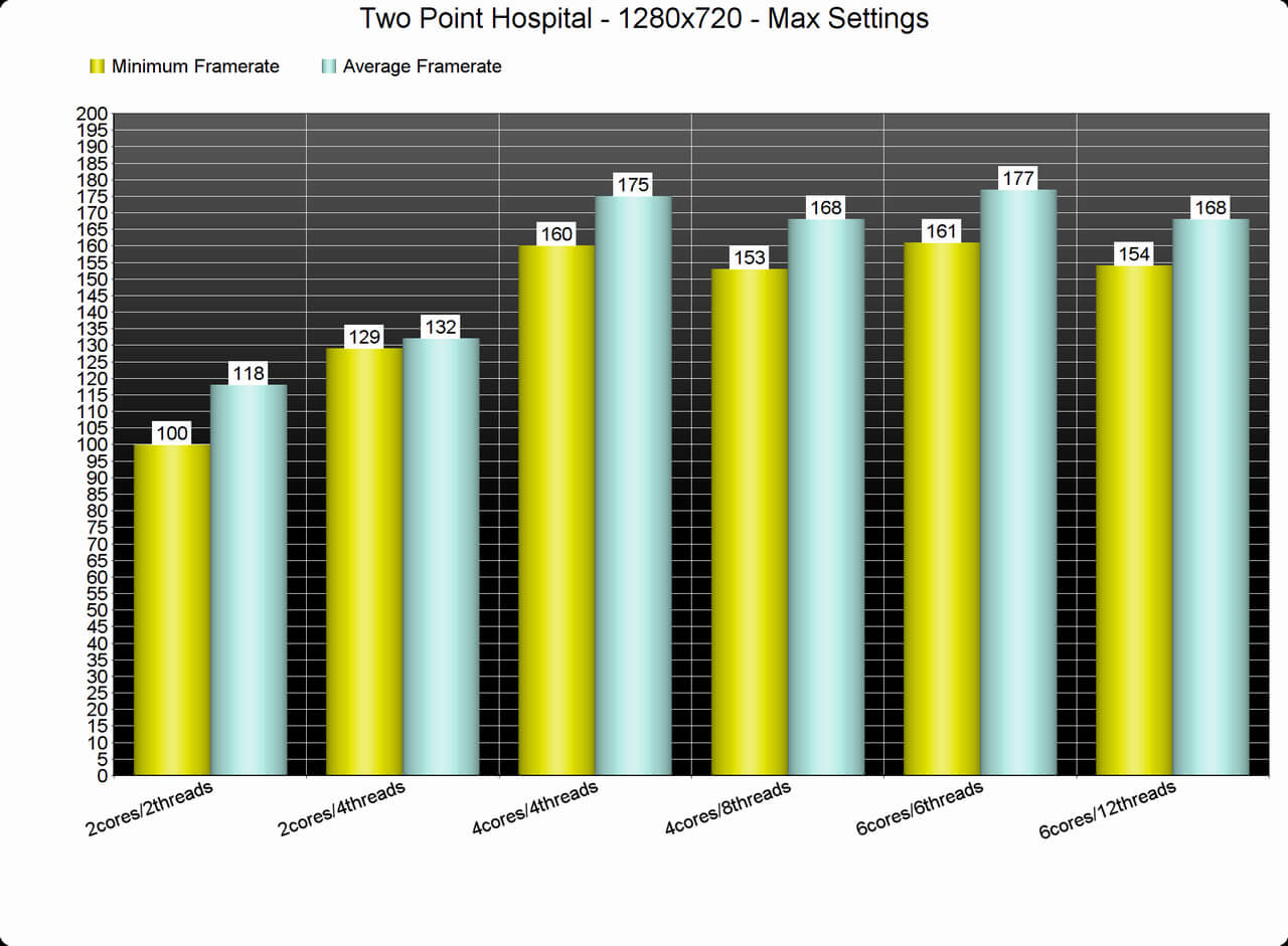 In order to find out how the game performs on a variety of CPUs, we simulated a dual-core and a quad-core CPU. And we are happy to report that even our simulated dual-core system was able to provide a smooth gaming experience. We did notice some performance differences between our simulated dual-core and our six-core systems, however all systems were running the game with more than 100fps at 1080p on Max settings. Furthermore, Two Point Hospital is one of the few games that does not benefit at all from Hyper Threading (in fact we noticed a slightly worse performance when Hyper Threading was enabled).