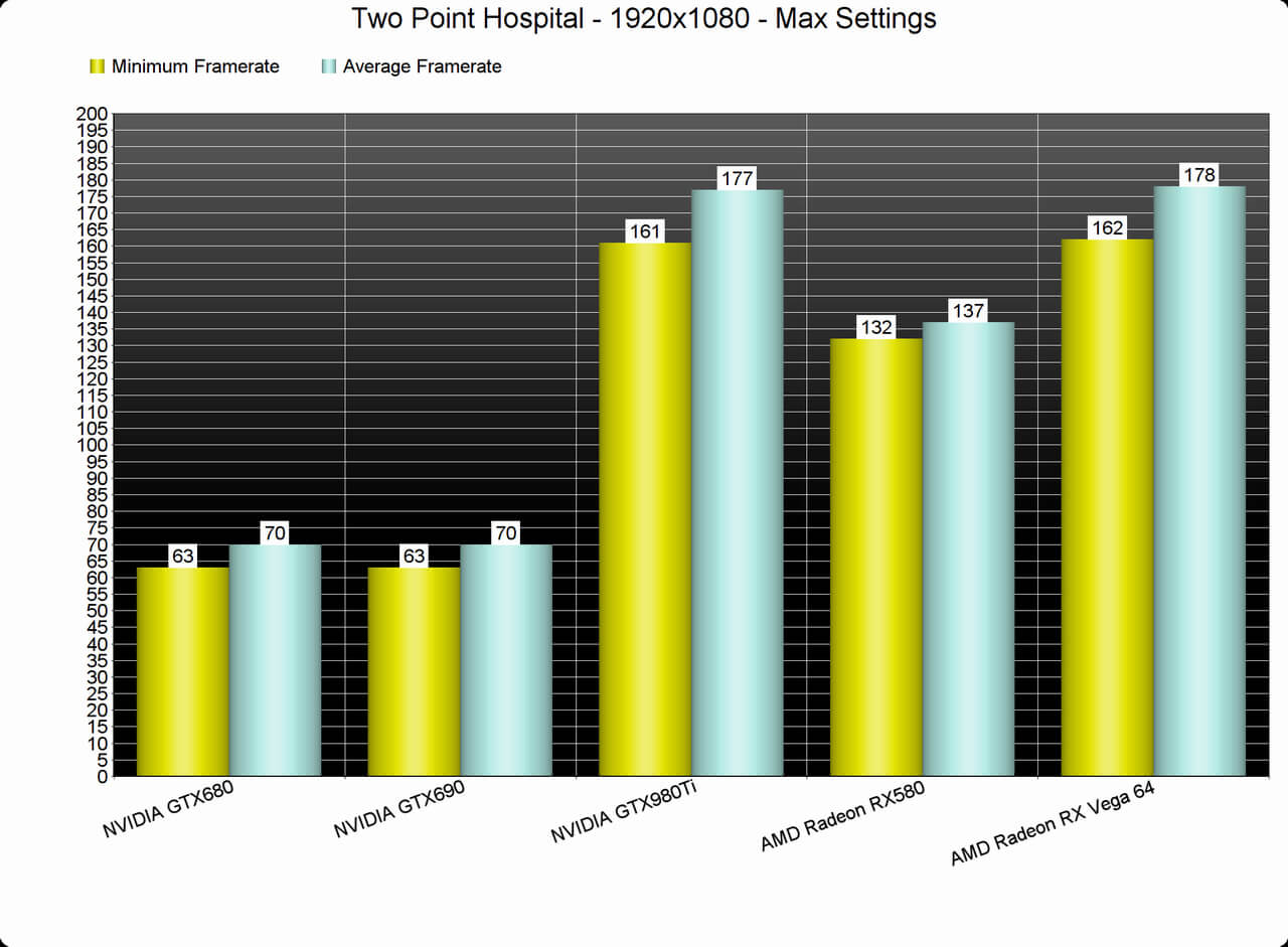 Two Point Hospital is also a game that seems to run great on both NVIDIA’s and AMD’s graphics cards. At 1440p both our GTX980Ti and our AMD Radeon RX Vega 64 were able to offer a smooth gaming experience. In 4K, though, our GTX980Ti was unable to offer a constant 60fps experience. On the other hand, our AMD Radeon RX Vega 64 was able to run the game with a minimum of 65fps and an average of 68fps.