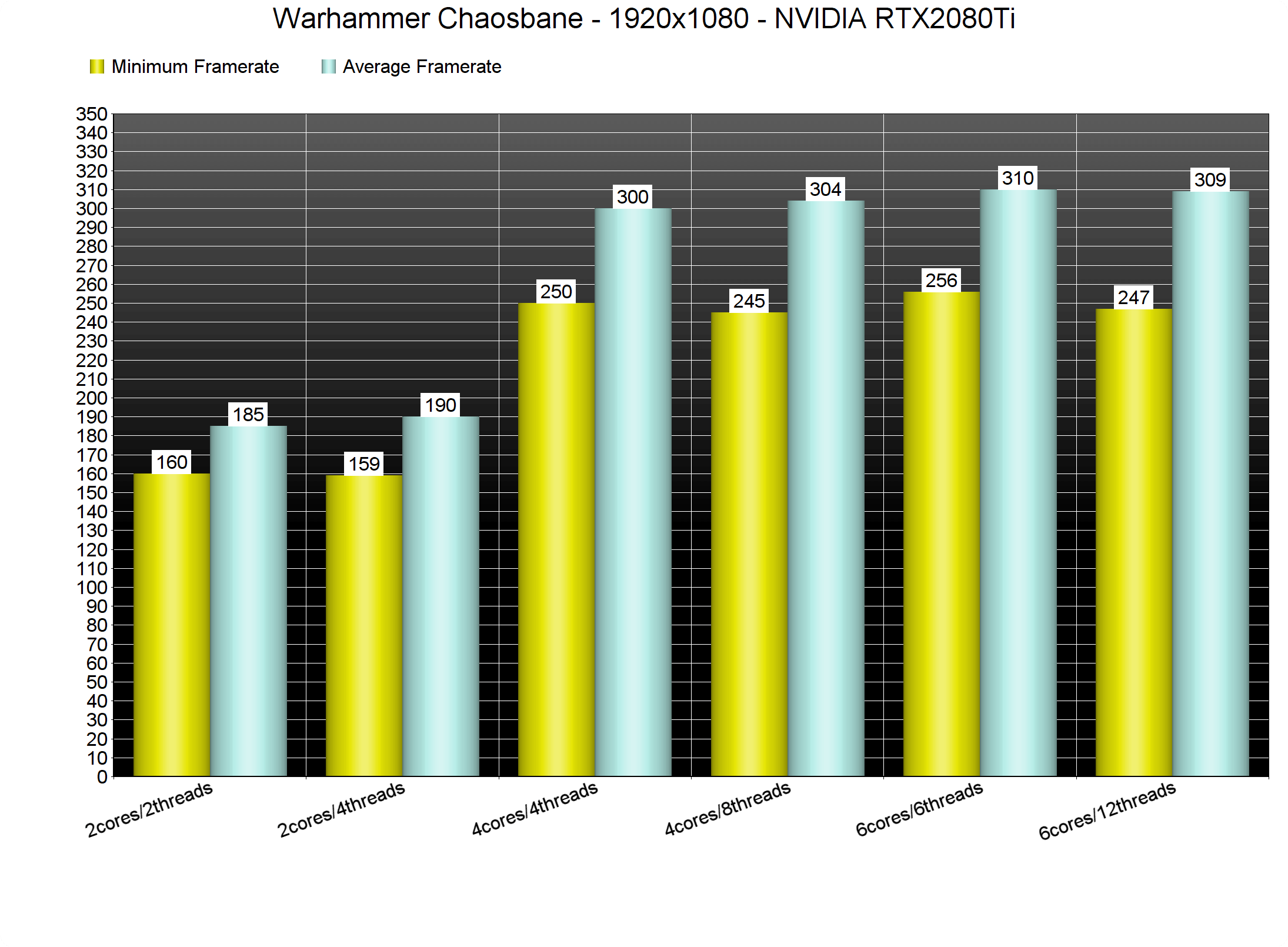 Performance wise, Warhammer: Chaosbane can run silky smooth on a wide range of PC configurations. In order to find out how the game scales on multiple CPU threads, we simulated a dual-core and a quad-core CPU. Even our simulated dual-core system (and without Hyper Threading) was able to achieve a constant 120fps experience at 1080p, meaning that PC gamers with really dated CPUs will be able to enjoy this latest action RPG.