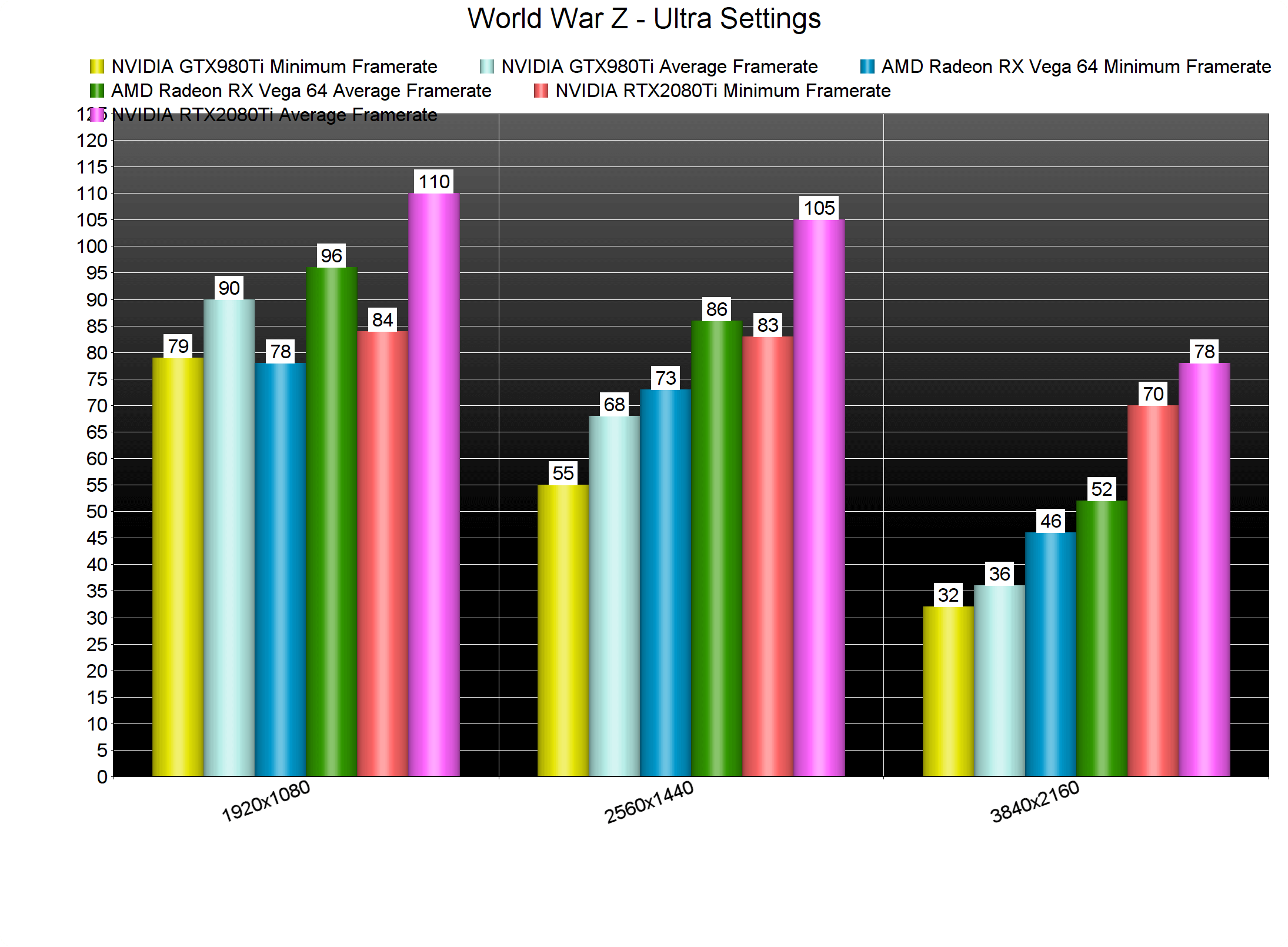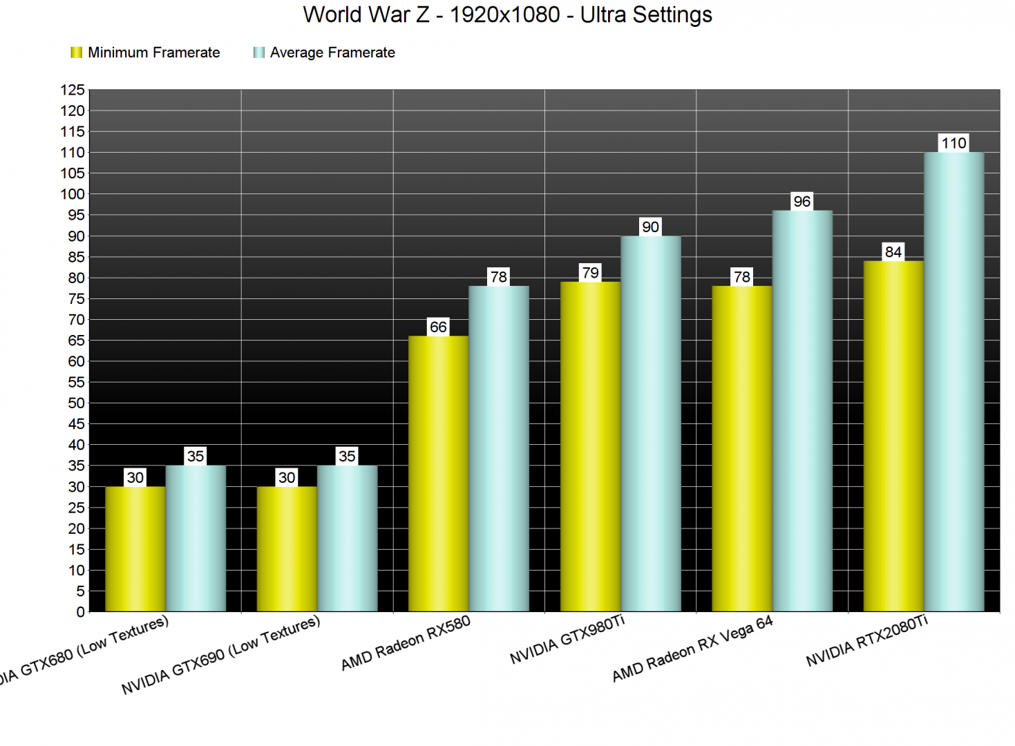 World War Z also does not require a high-end GPU in order to be enjoyed. At 1080p/Ultra, our AMD Radeon RX580, RX Vega 64, NVIDIA GTX980Ti and RTX2080Ti were able to offer a smooth gaming experience. Not only that, but our dated GTX680 (with Low Textures mind you) was able to offer a smoother experience than current-gen consoles. The game is currently locked at 30fps on consoles and our GTX680 was able to run the game with a minimum of 30fps and an average of 35fps. Also note that we were memory limited at 1080p on both of our AMD Radeon RX Vega 64 and NVIDIA RTX2080Ti.