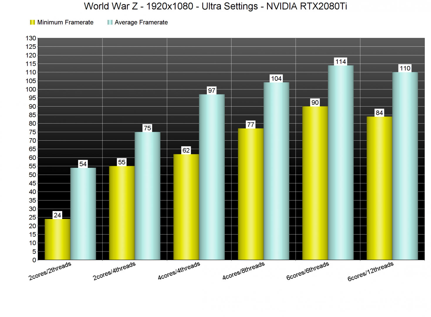 In order to find out how the game performs on a variety of CPUs, we simulated a dual-core and a quad-core CPU, and we are happy to report that even our simulated dual-core system was able to provide a playable experience at 1080p and on Ultra settings. Without Hyper Threading, our simulated dual-core system was able to push a minimum of 24fps and an average of 54fps, and we also experienced occasional stutters. With Hyper Threading enabled, our simulated dual-core system offered a minimum of 55fps and an average of 75fps.
