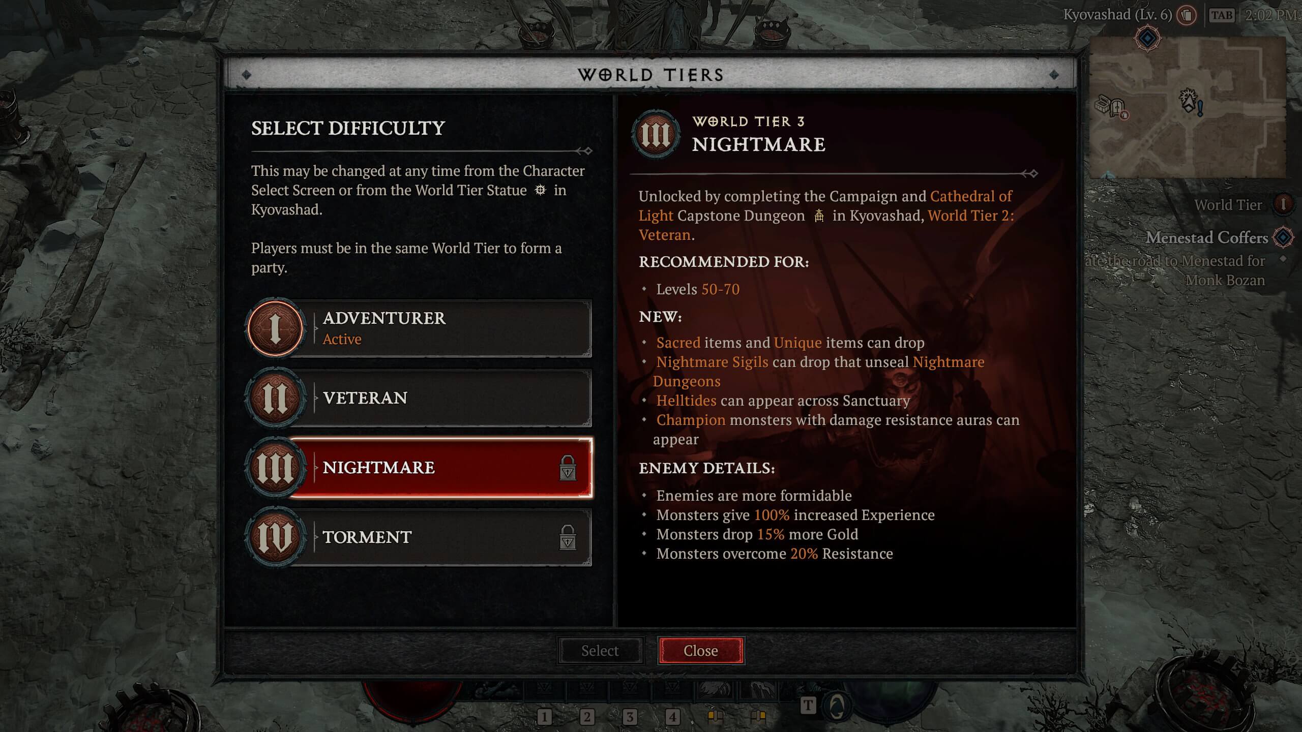 The endgame begins around level 50 after you finish the story and complete a special capstone dungeon. At this point, a new difficulty level is unlocked that adds three main activities: Helltides, Nightmare Dungeons, and Whispers.