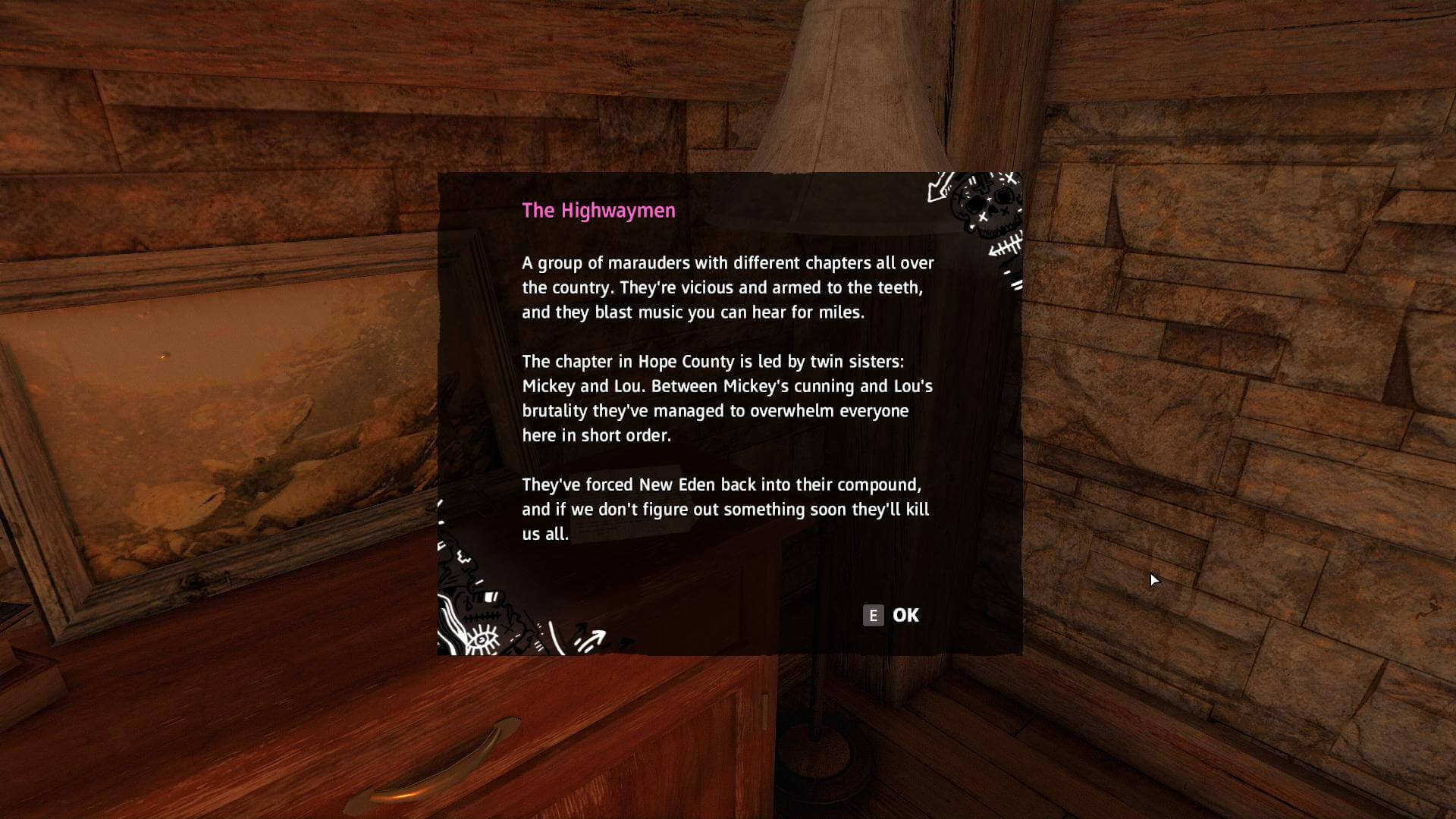 For the sake of spoilers I am only going to say that the game continues exactly where the fifth game ends (or to be more precise from a specific ending since there was more than one). Seventeen years after the incident people resurface and start to rebuild the world. A group of ruthless murderers called the Highwaymen, led by the twins Mickey & Lou, terrorize the inhabitants of Hope county in Montana (I get it’s a catchier name but why not Highwaywomen since most of them are women? I mean even the leaders are women. Just a thought).