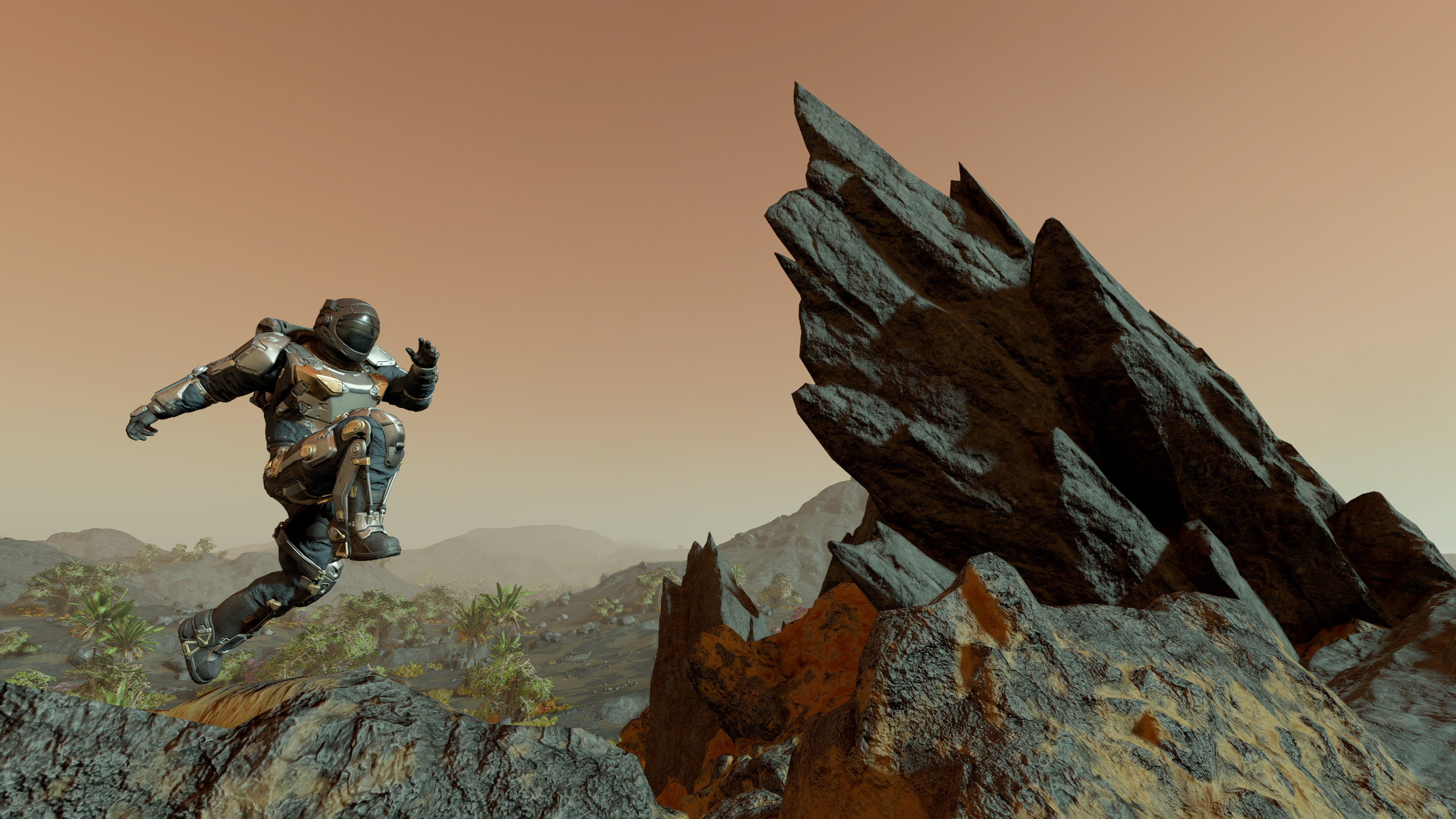 Yes, you can land on planets, but those planets are almost entirely procedurally generated. What’s worse, the discoverable locations on said planets are copy-and-paste jobs based on a handful of prefabricated designs. Get used to seeing cookie-cutter locations over and over, each almost always lacking any meaningful gameplay experiences. You can’t even fly your spaceship on the planets or manually land or fly away. Rather, you land via cutscene and then must drearily hoof it on foot.