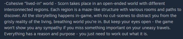 In SCORN, every location will contain its own theme (story), puzzles and characters that are integral in creating a cohesive world. Throughout the game players will open up new areas. Players will also acquire different skill sets, weapons, various items and try to comprehend the sights presented to them.