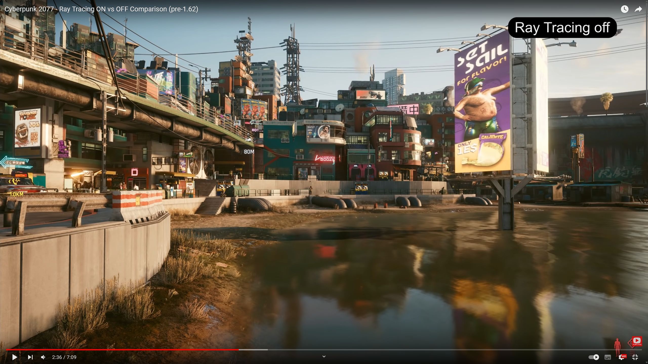 The reflections in water without ray tracing being poor is the result of the low resolution they are rendered at (try turning off the anti-aliasing some time and look at how blocky the reflections are). That being said, what ray tracing does to the reflections in Cyberpunk isn't better, because the effect is overblown and doesn't look good. You're also not going to notice the difference when running or driving anyway.