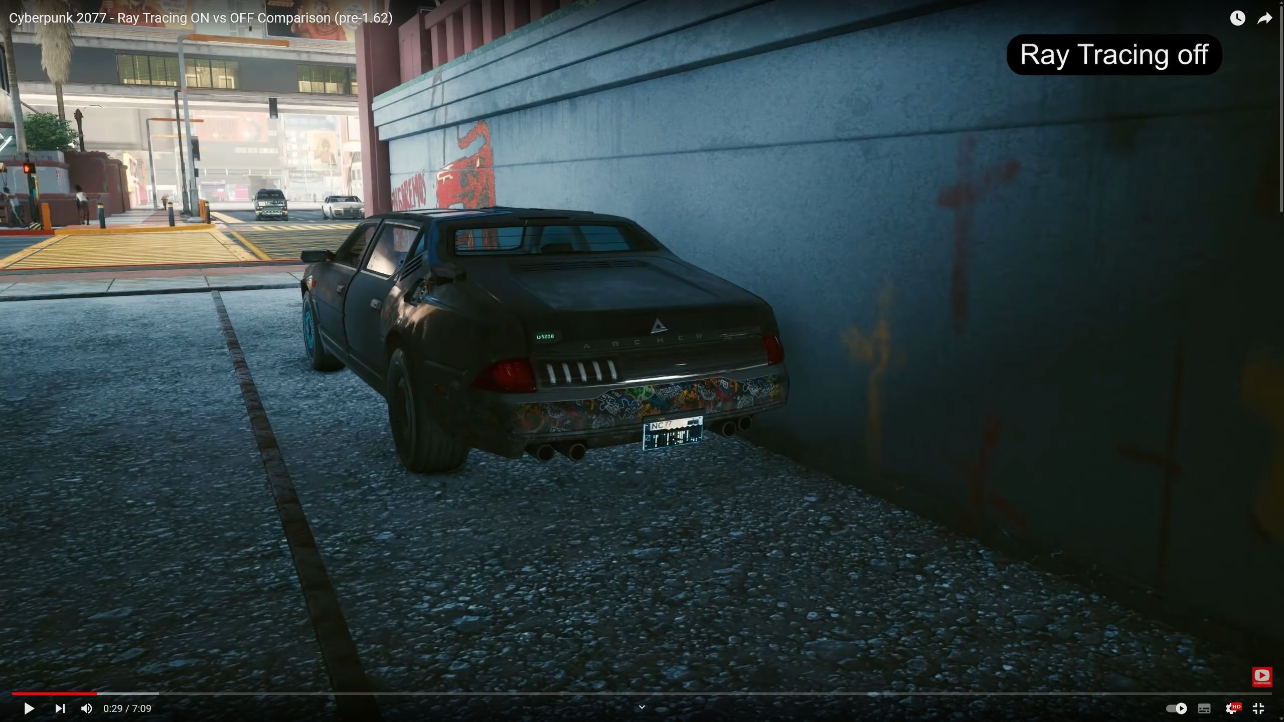 For example, this comparison. Can you see that this car is missing indirect shadows without RT? Reflections on this car also look much better. With RT, there is also a natural bounce of color off the wall.