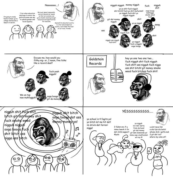 and [c]rap music is cancer, it’s f**king jungle noises made by jungle people, popularized by the (((mainstream))) media to subvert decent folk into talking and acting like N*ggers