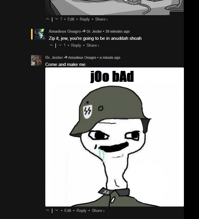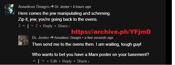 6. I mean, I’ve shown you his comment history and he is not spamming the same comment in every article. Assuming though we ban Fernando (because, let’s say, 70% he shares an “Excellent” comment). Then, we must also ban Latex for sharing Jews stuff (7/10 times), we should ban SShekelhertz because his comments are images with Jews (8/10). And we should ban everyone that posts insults if the ratio is 7/10. I mean, I’m fine if you guys want this, but are you SURE you are fine with this? 😛