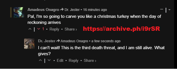 Then we have people doing downright illegal stuff, like death threats here, which I believe is kinda akin to what I mentioned in my previous message. A great place to read stuff, ruined by yapping and yelling spergs like these people.