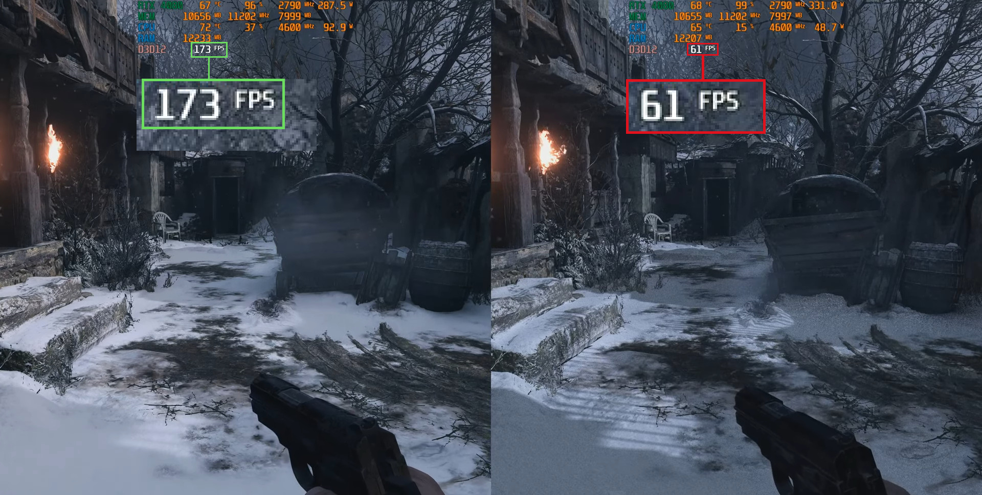 The good news here is that PC gamers have figured out how to enable DLSS in RE: Village. So, by using DLSS, you can get an acceptable performance, even at 4K on a high-end GPU. In the following video, we can see the NVIDIA GeForce RTX 4080 pushing 60fps at 4K with DLSS 3.7 Quality Mode.