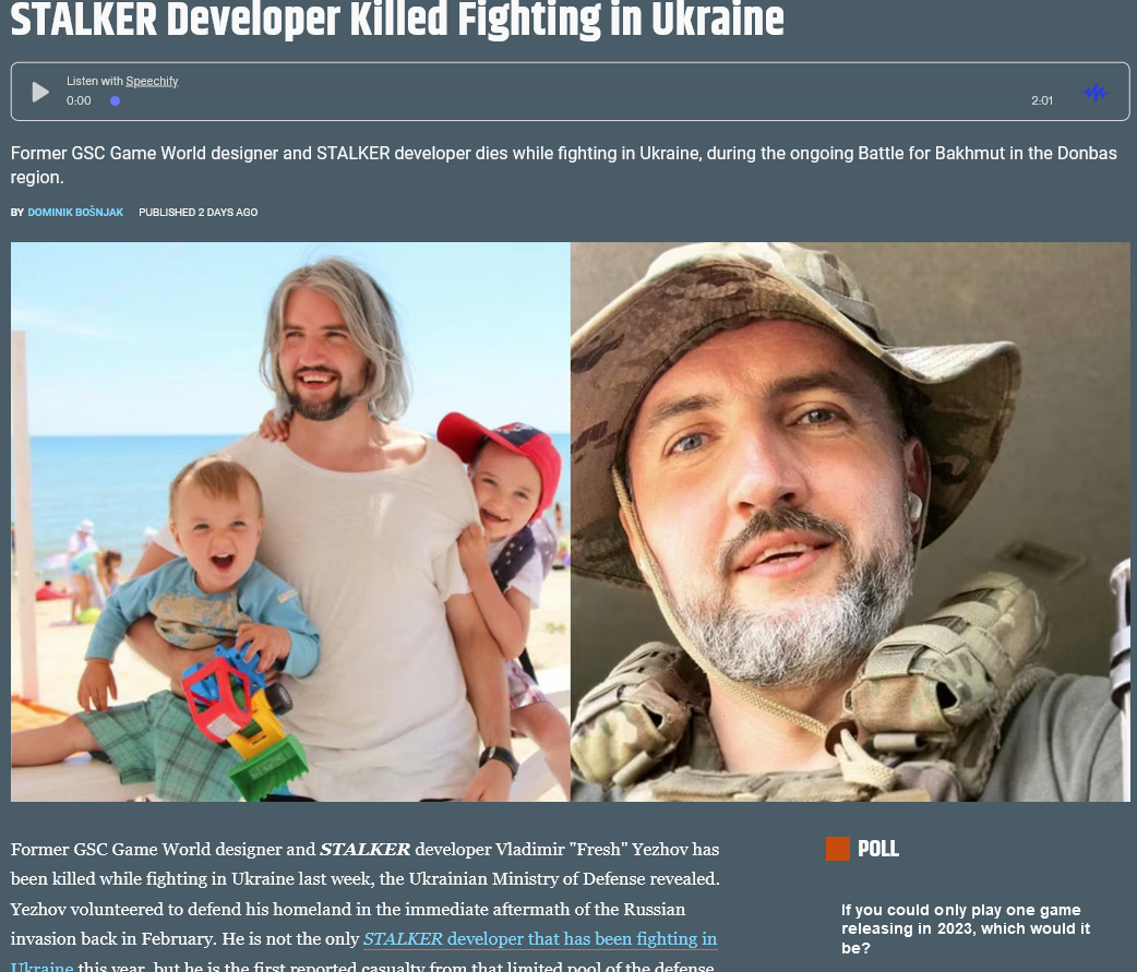 Tragic news, apparently the developer behind the original S.T.A.L.K.E.R was killed in combat in Ukraine.