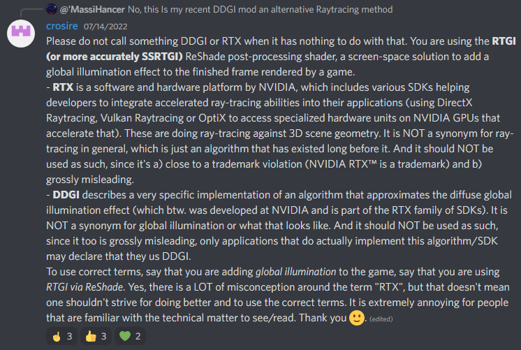RTGI is useless, it bleeds through every UI, loading screen and map. Only realistic use I could find for it was screenshots. I wonder if this technique has the same limitations, most likely.
