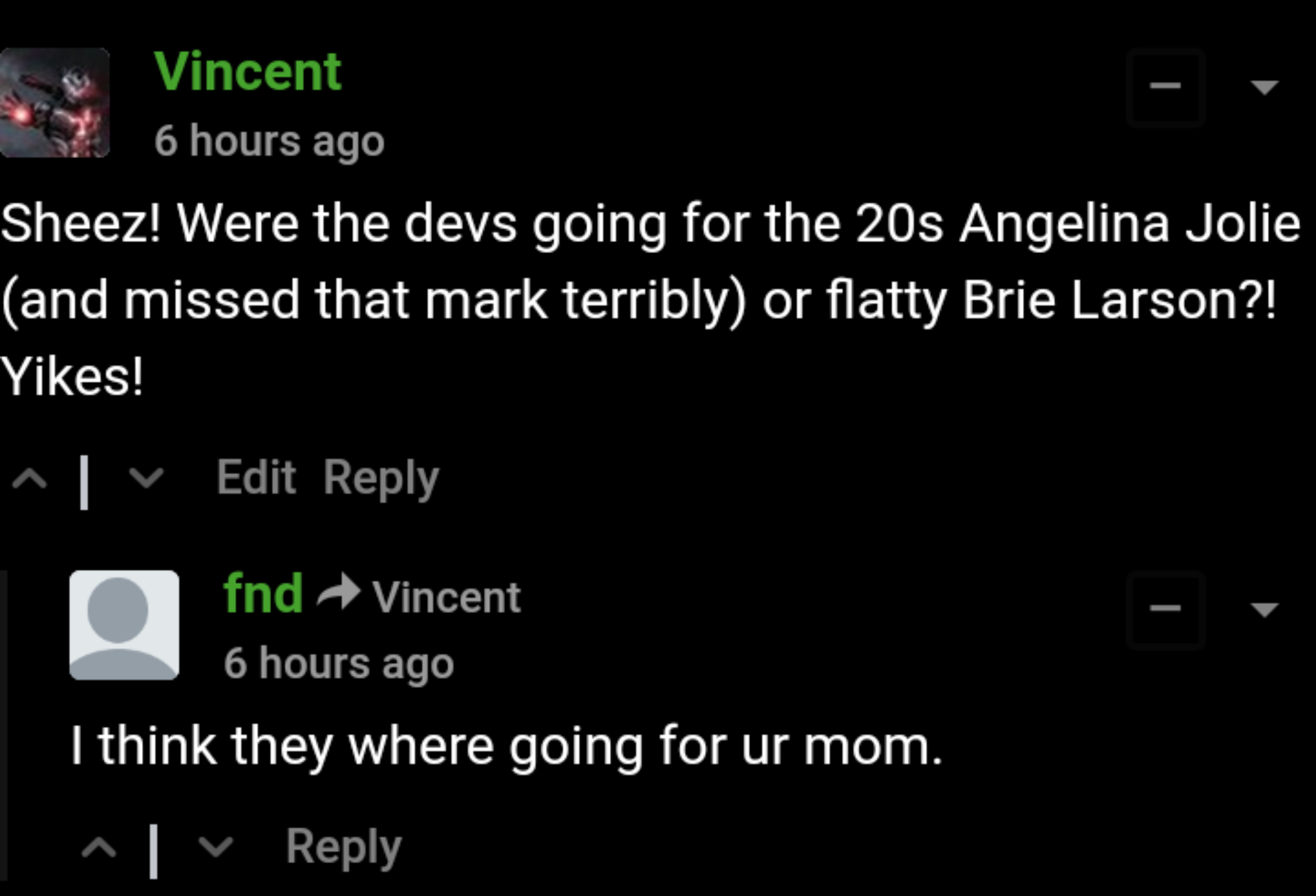 Sheez! Were the devs going for the 20s Angelina Jolie (and missed that mark terribly) or flatty Brie Larson?! Yikes!